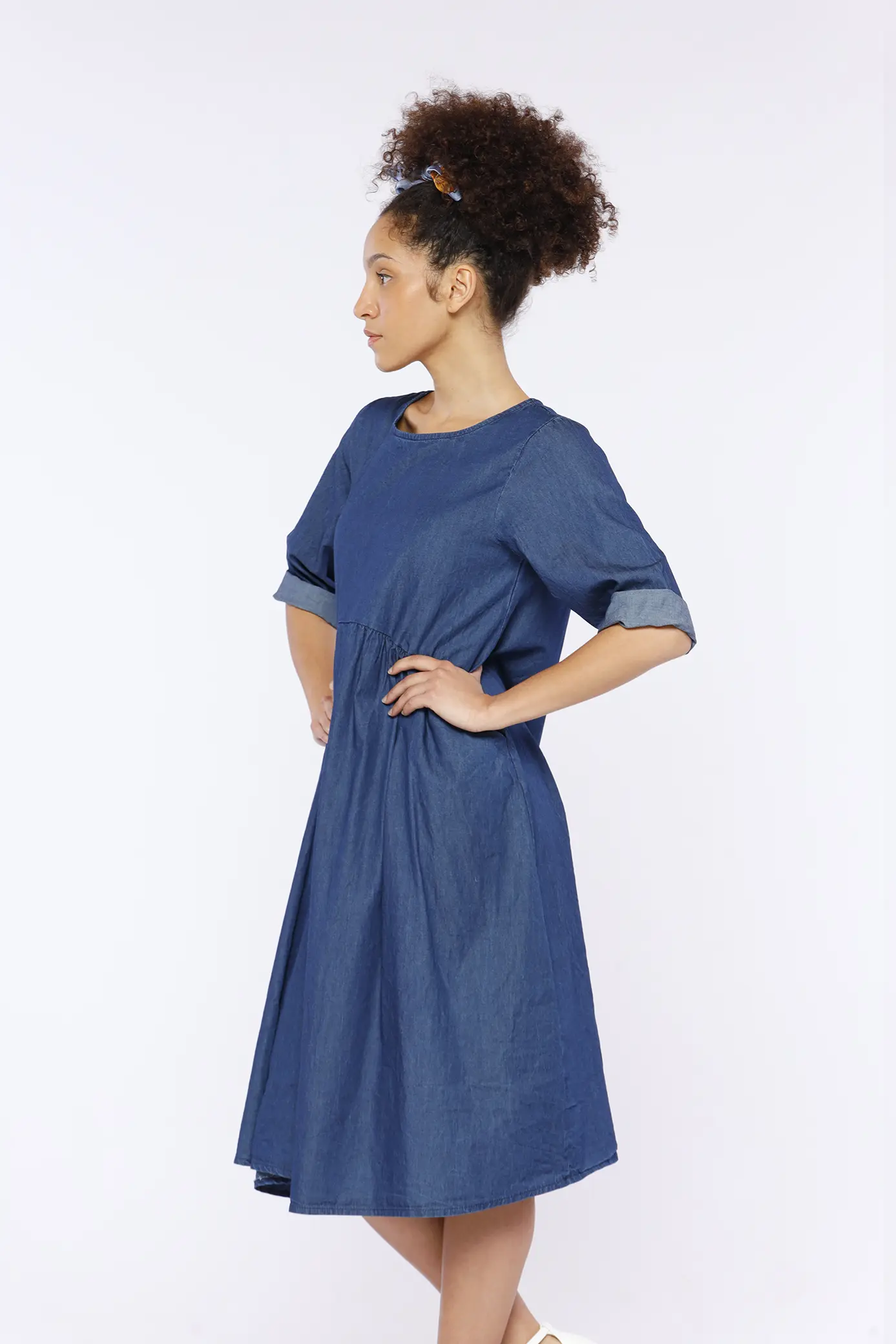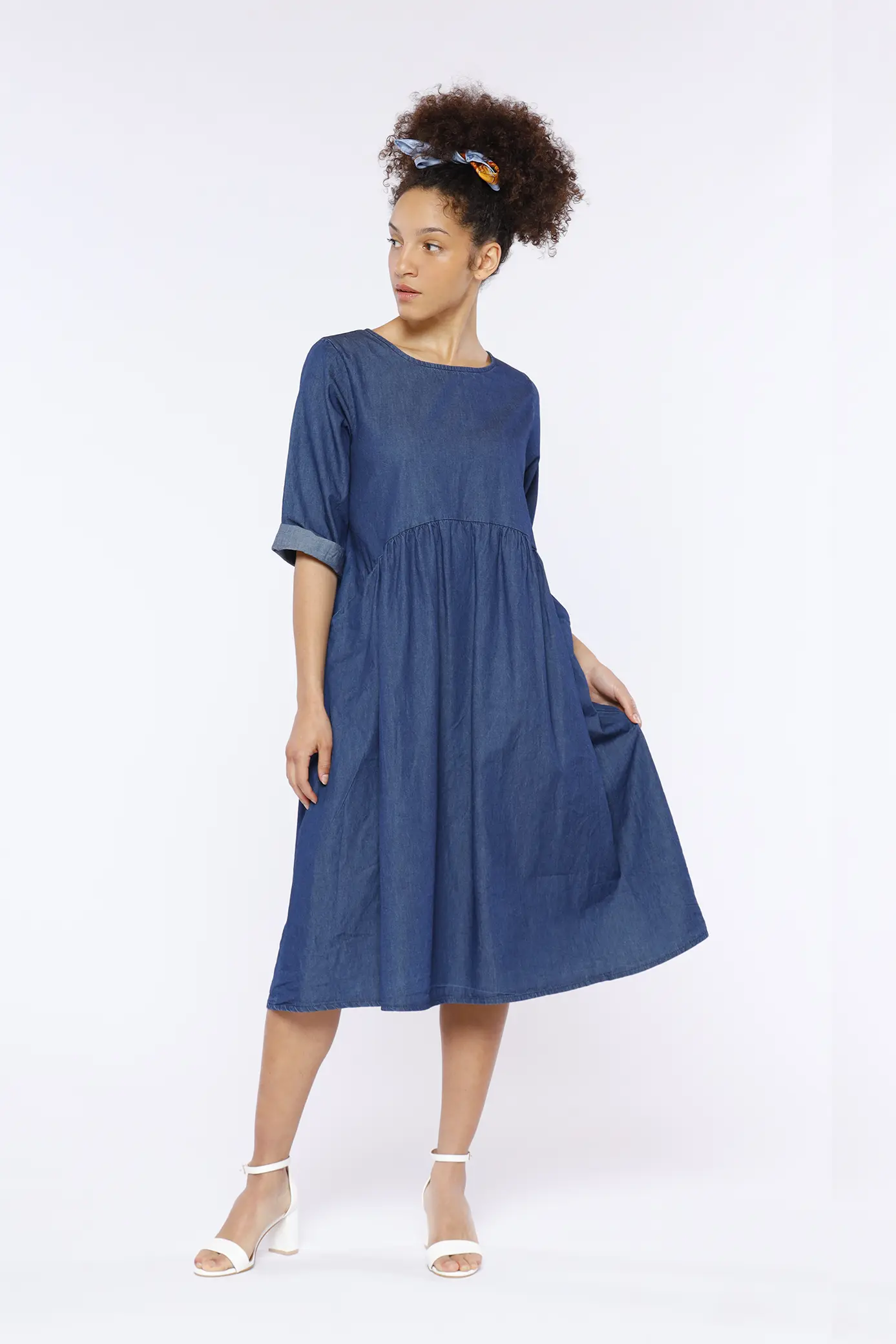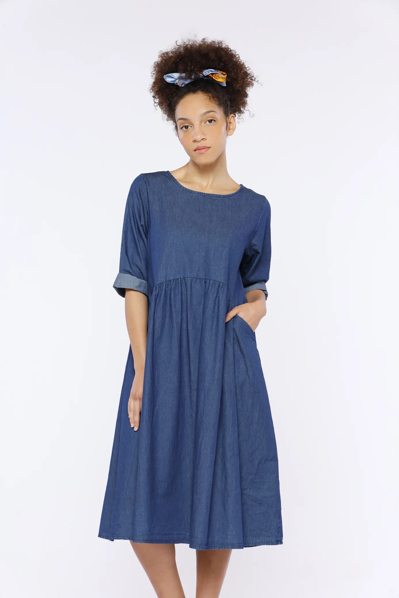 Abito con scolloa giro, taglio impero, lungo a maniche lunghe. Il busto è definito da un taglio alto stile impero con linea curva, da cui parte una gonna ampia con arricciature frontali. Sui fianchi sono inserite due ampie tasche diagonali a scomparsa. Orlo dritto e impunture tono su tono a chiudere il capo.