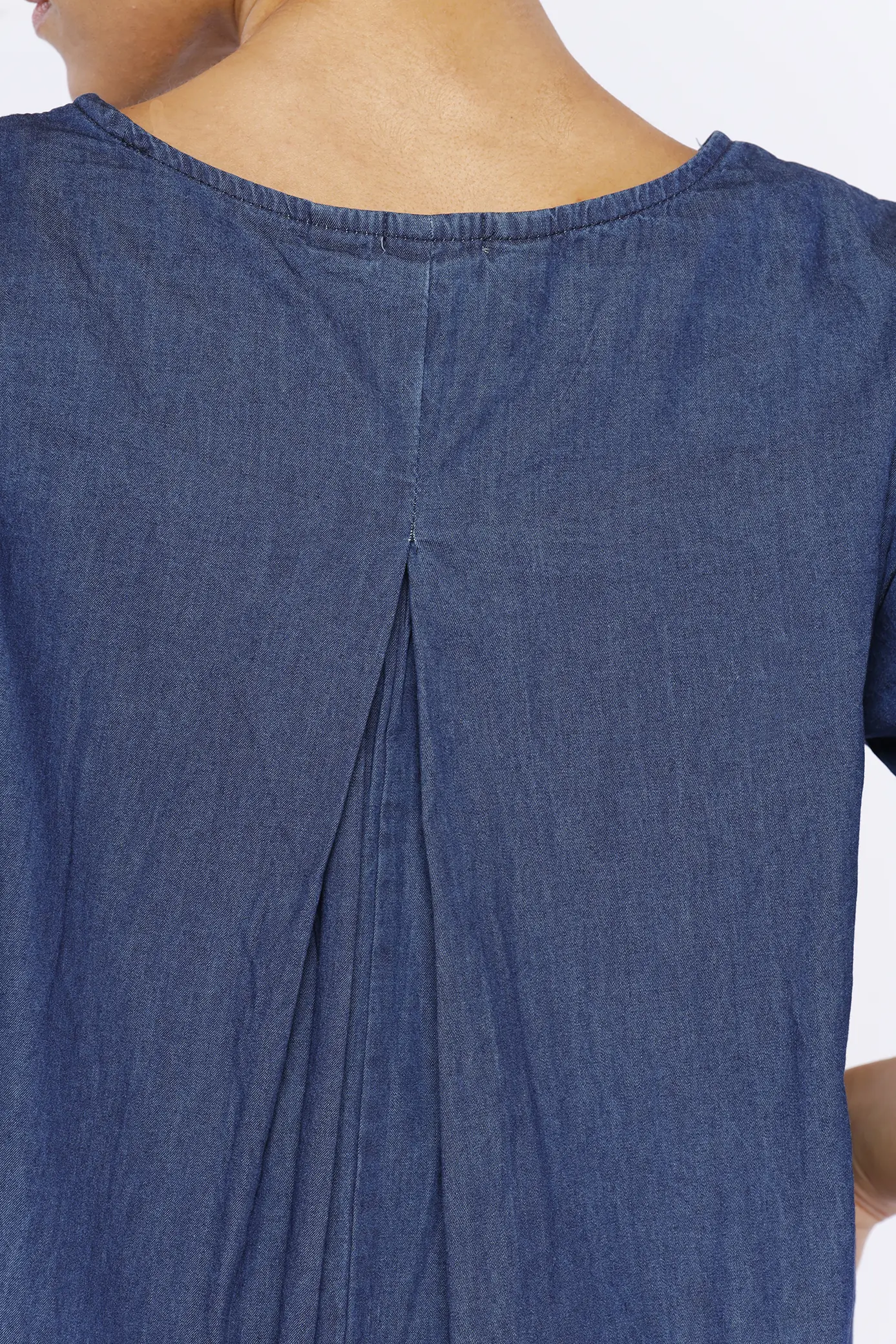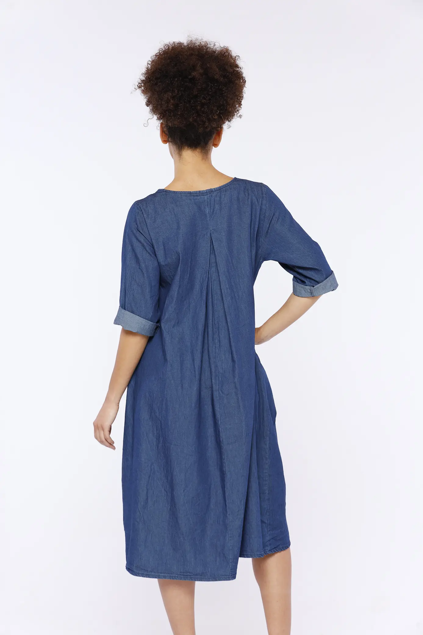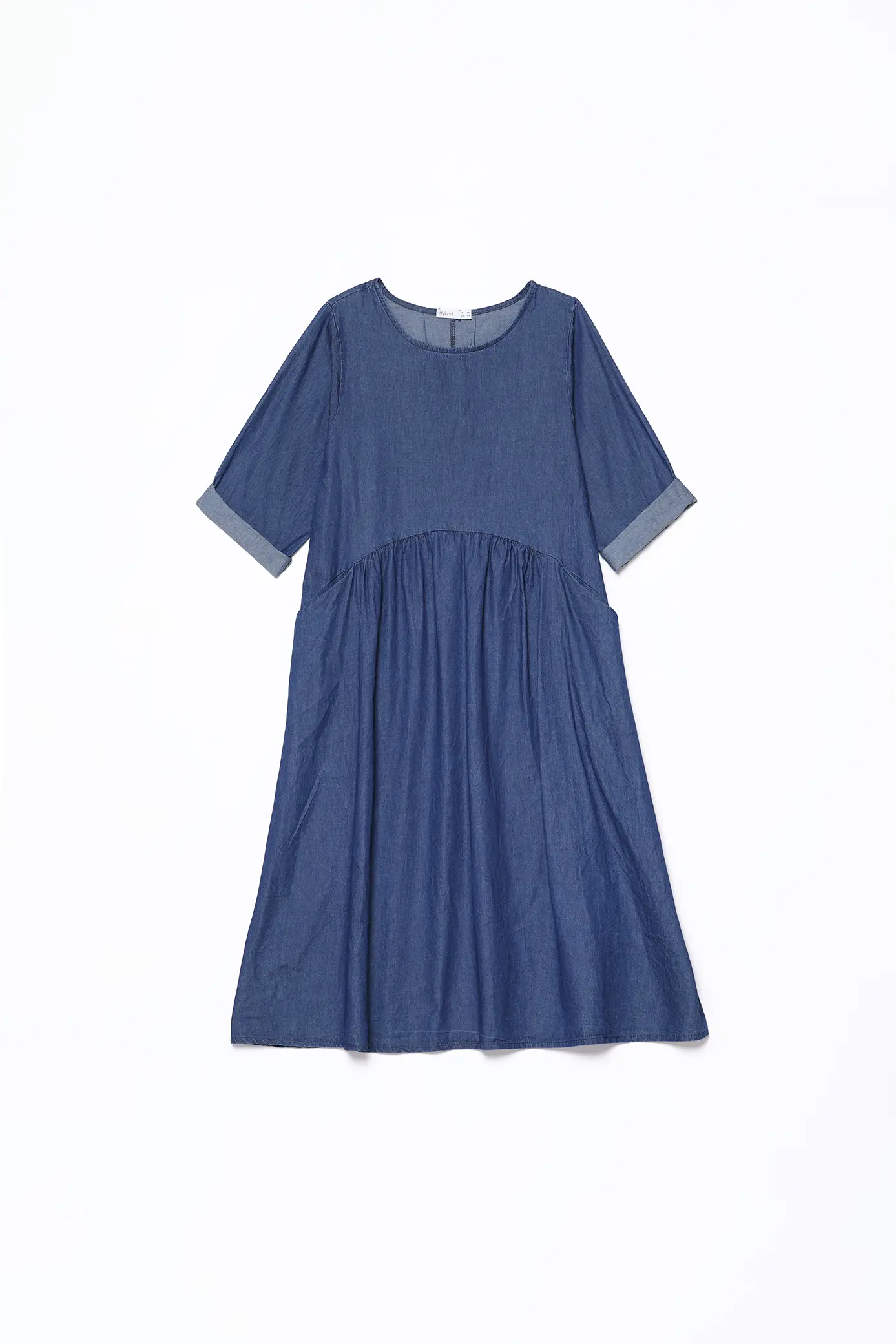 Abito con scolloa giro, taglio impero, lungo a maniche lunghe. Il busto è definito da un taglio alto stile impero con linea curva, da cui parte una gonna ampia con arricciature frontali. Sui fianchi sono inserite due ampie tasche diagonali a scomparsa. Orlo dritto e impunture tono su tono a chiudere il capo.