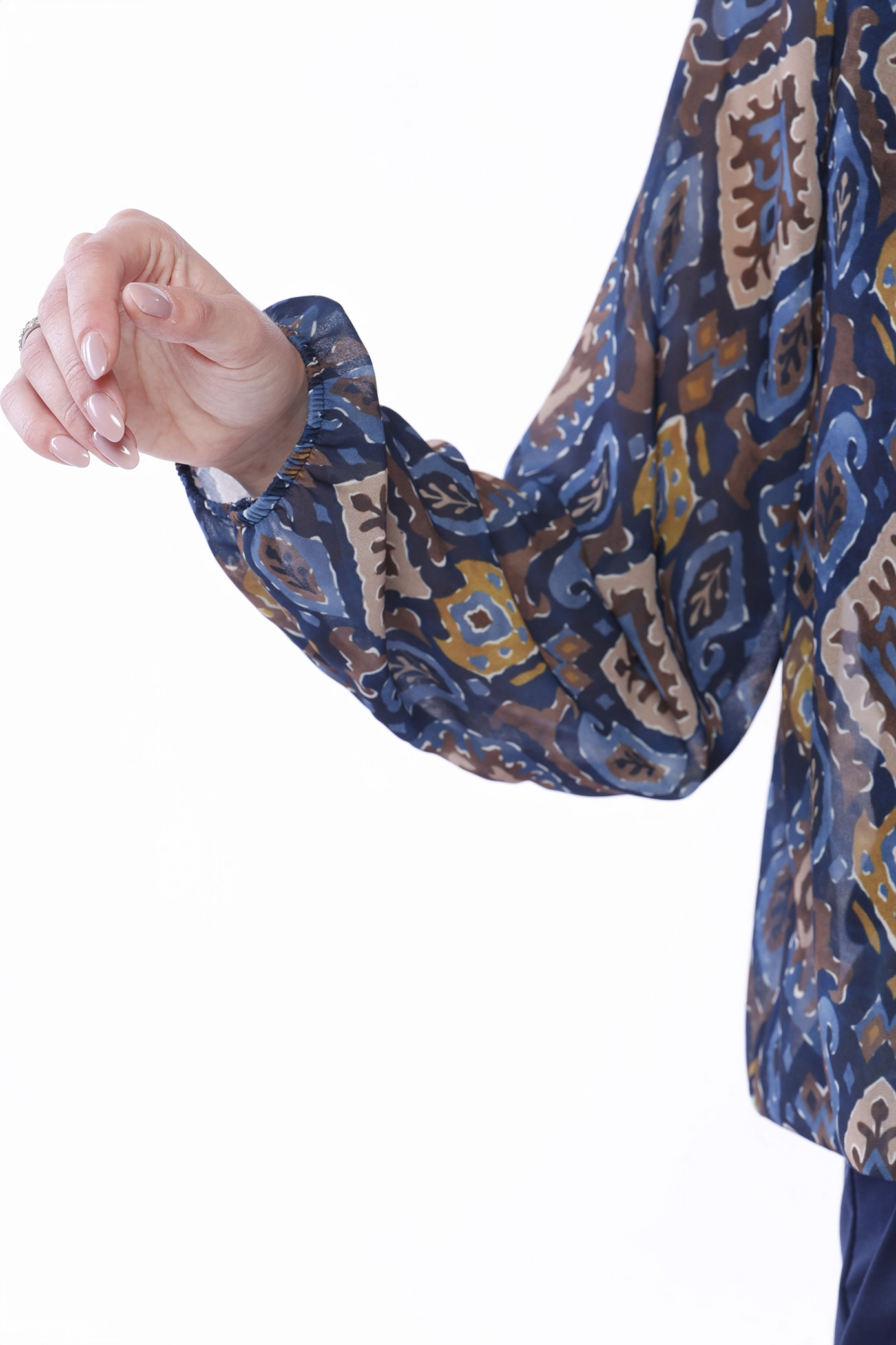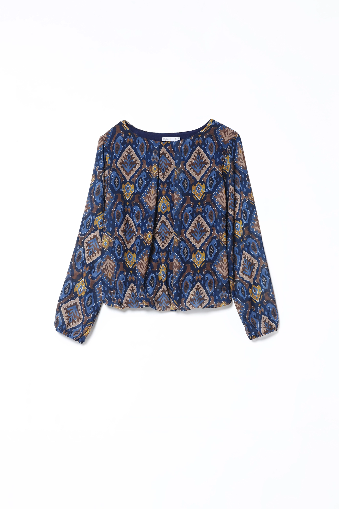 Blusa a stampa ikat,con scollo a giro orli a sbuffo ed eleganti pence sul davanti