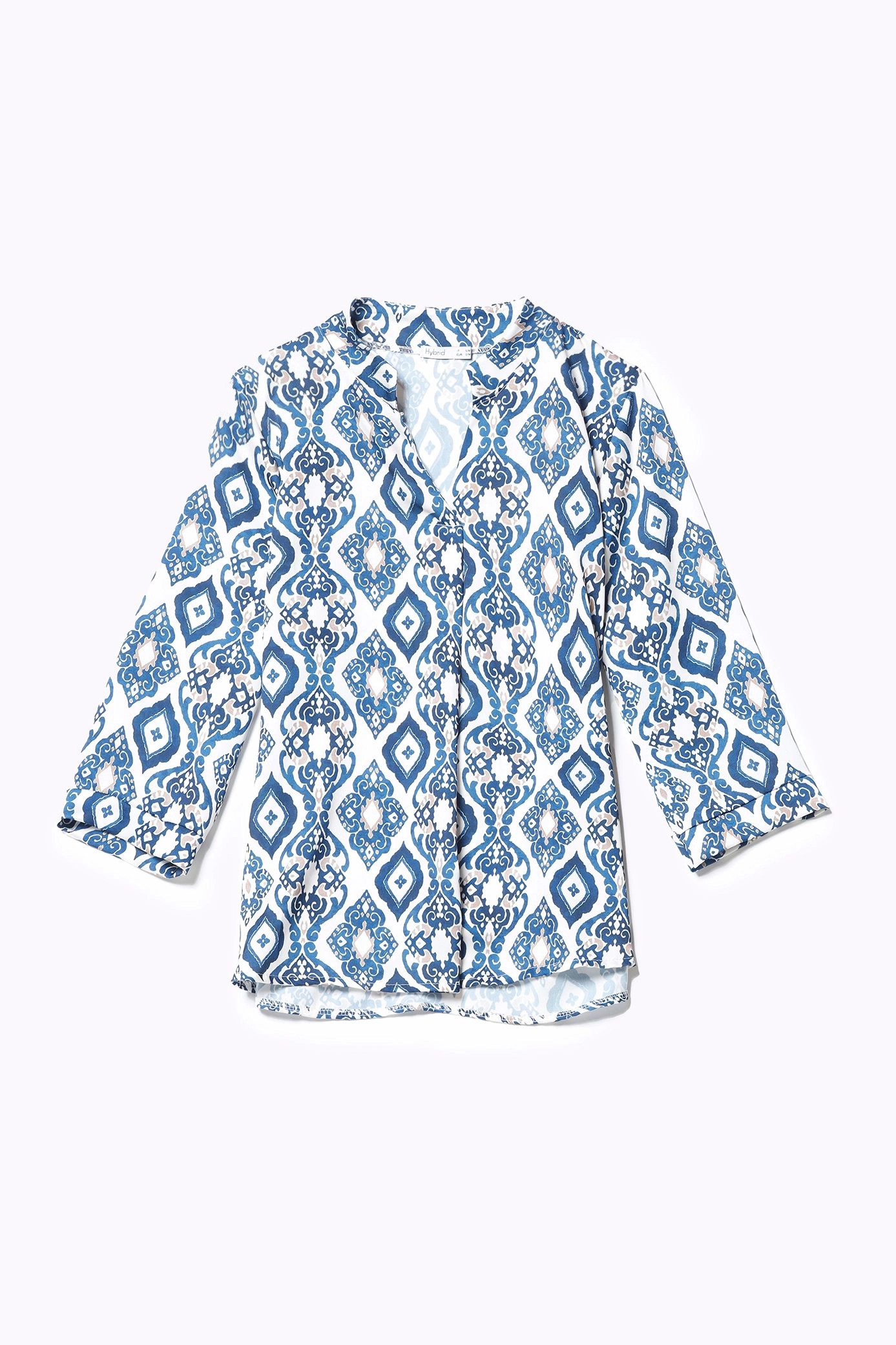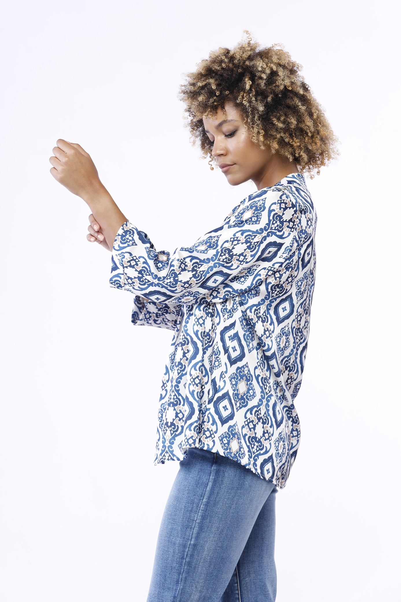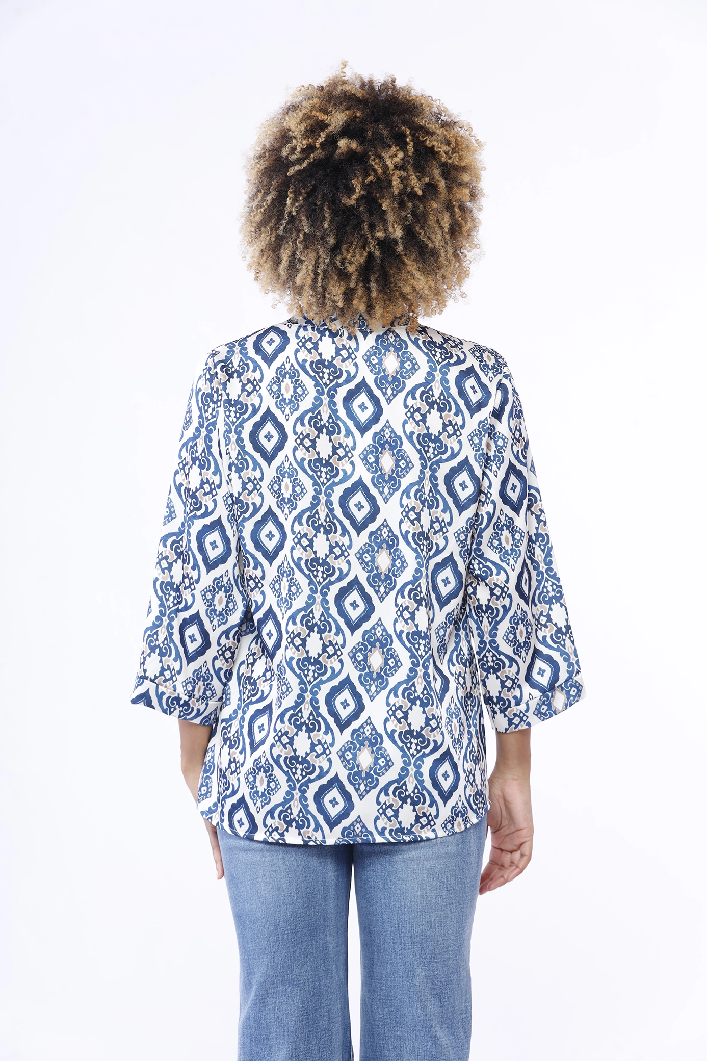 Blusa ampia con manica a tre quarti, stampa fantasia orientale e colletto alla coreana aperto sul davanti