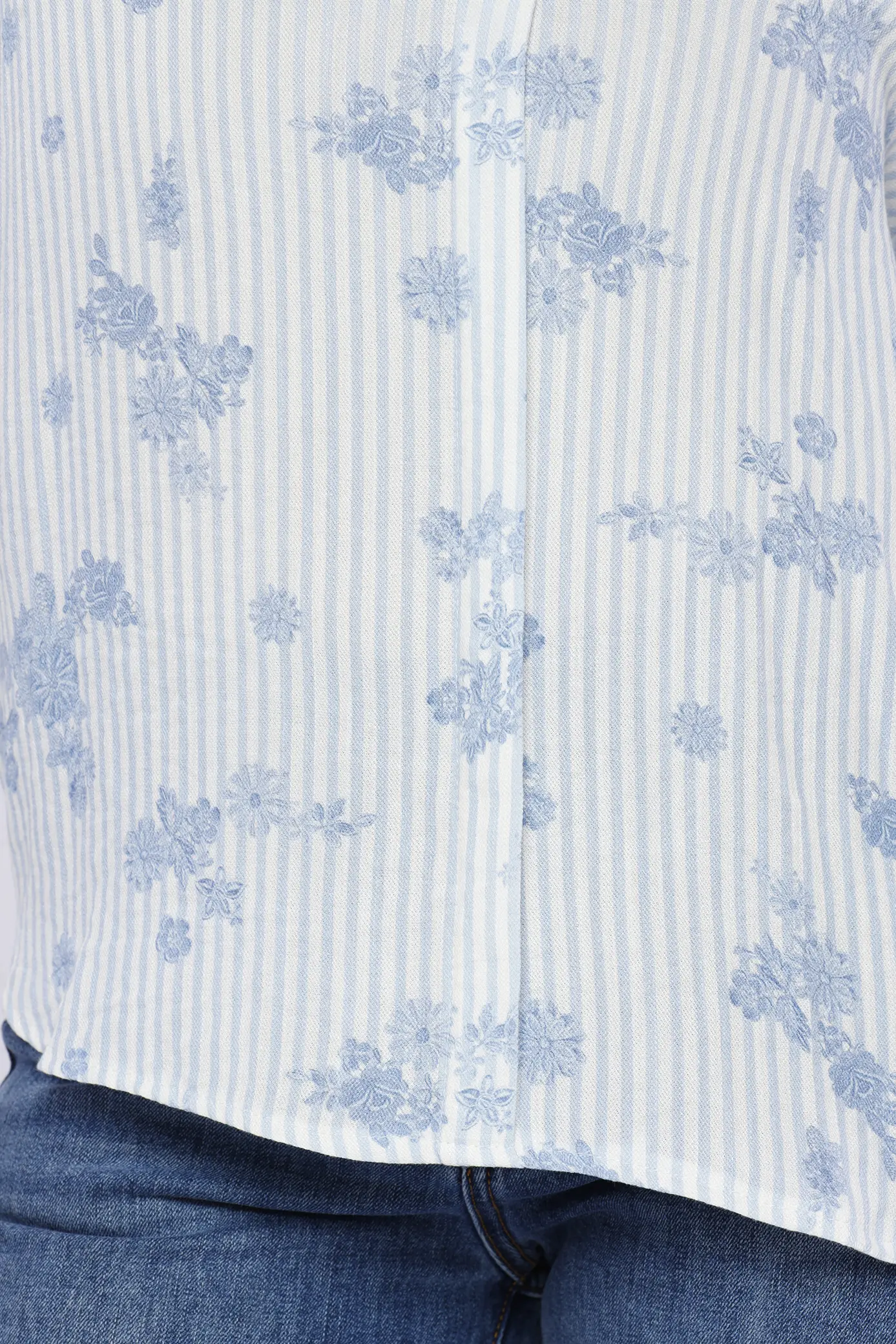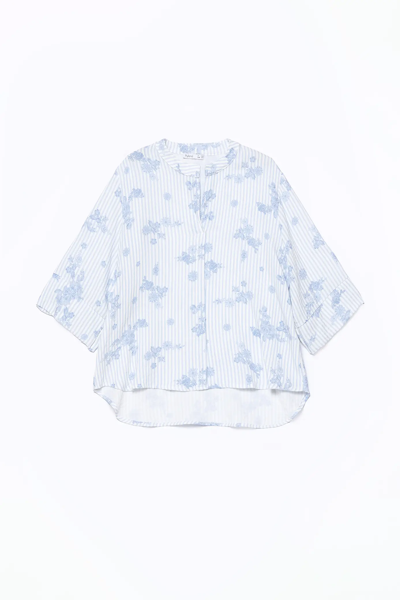Blusa da donna con scollo a V e abbottonatura frontale . Modello caratterizzato da carré posteriore con piega a cannoncino centrale, maniche a tre quarti con fondo risvoltato e orlo dritto.