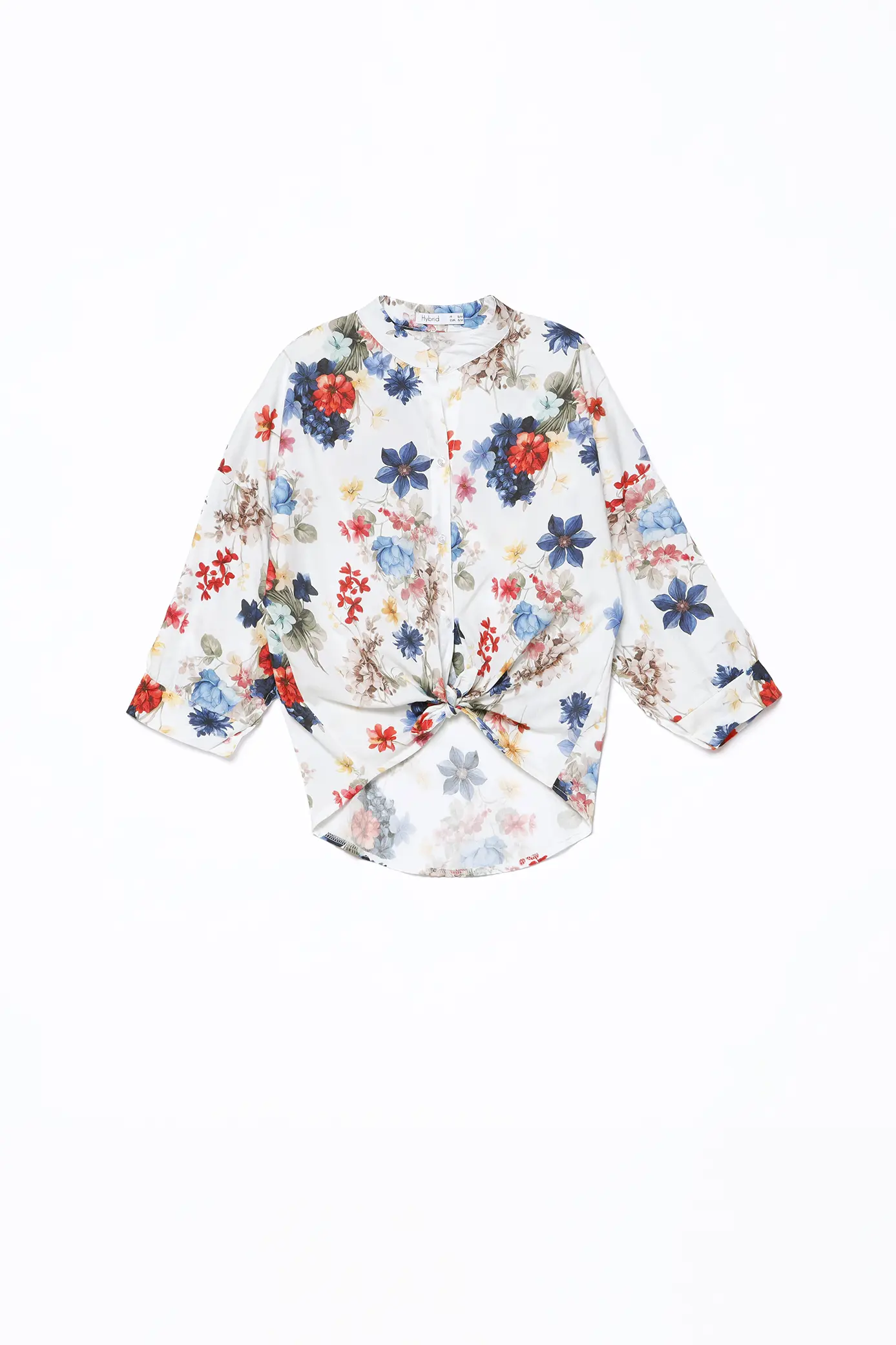 Camicia donna con colletto alla coreana e maniche a tre quarti. Il capo ha una vestibilità comoda, un giromanica sceso che si conclude con un piccolo polsino. Il capo si chiude sul fondo con un orlo asimmetrico, più corto sul davanti e allungato sul retro.
