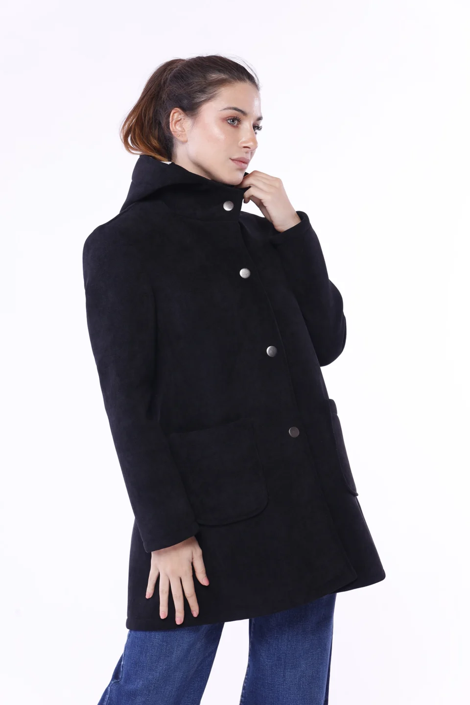 Cappotto primavera bicolore, con cappuccio, chiusura a bottoni e comode tasche laterali
