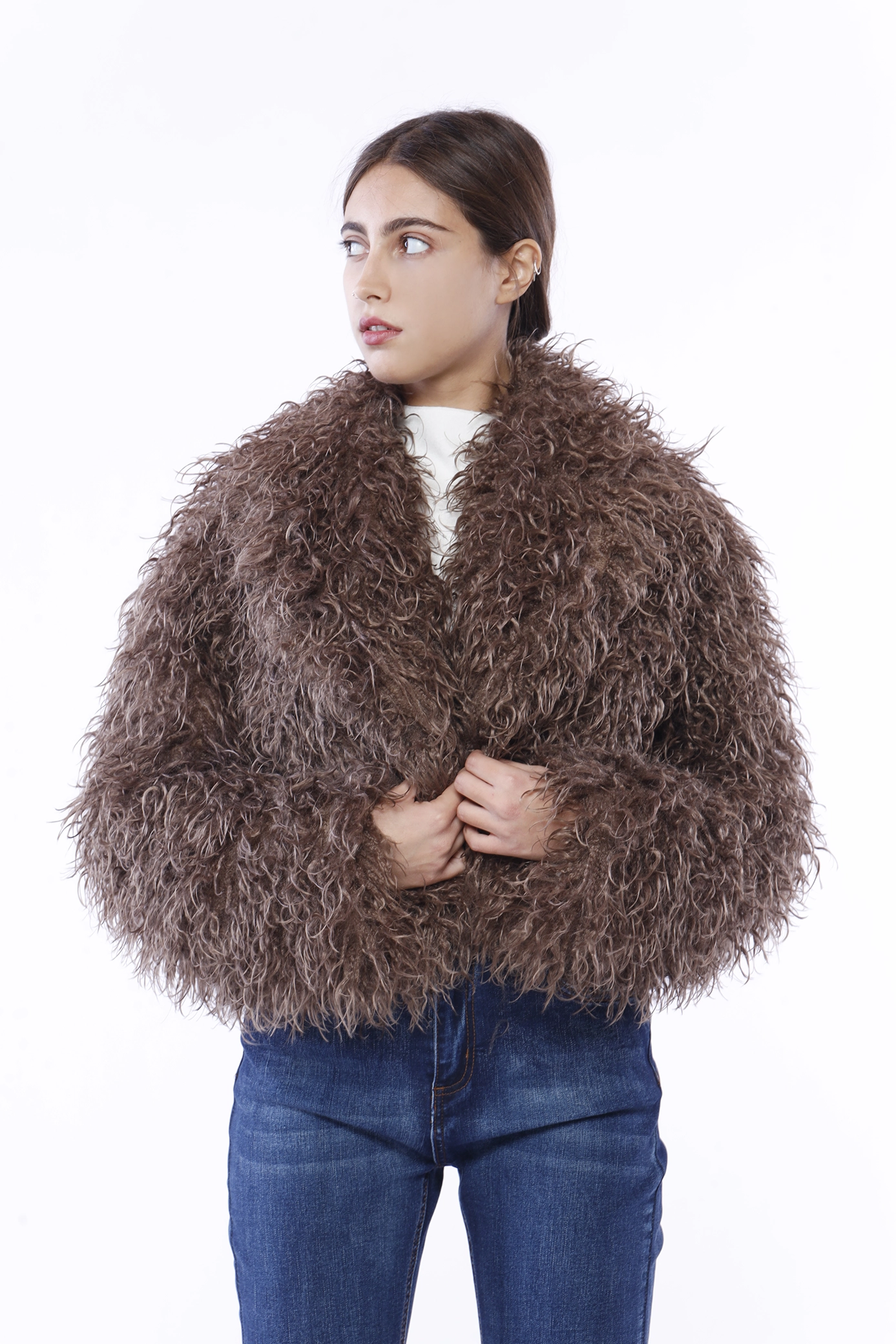 Pelliccia corta riccia di tendenza, moderna con collo reverse e chiusura a occhiello