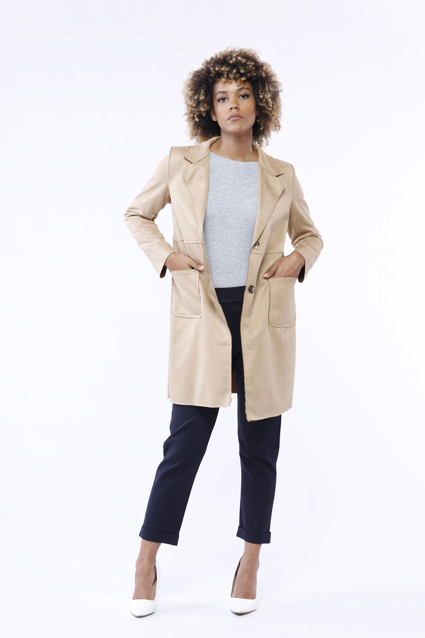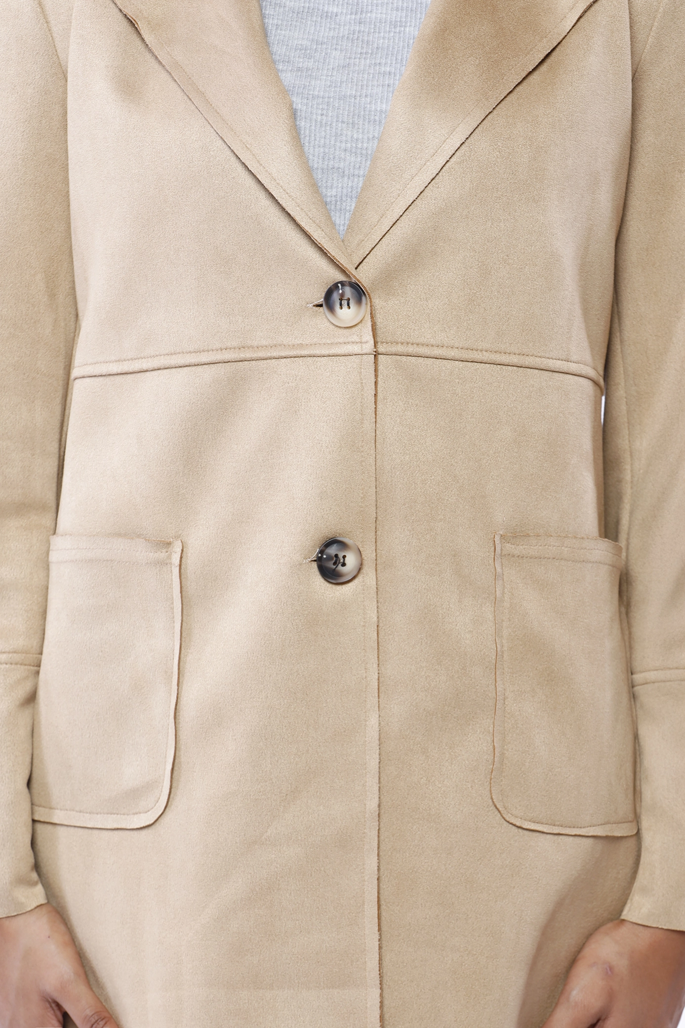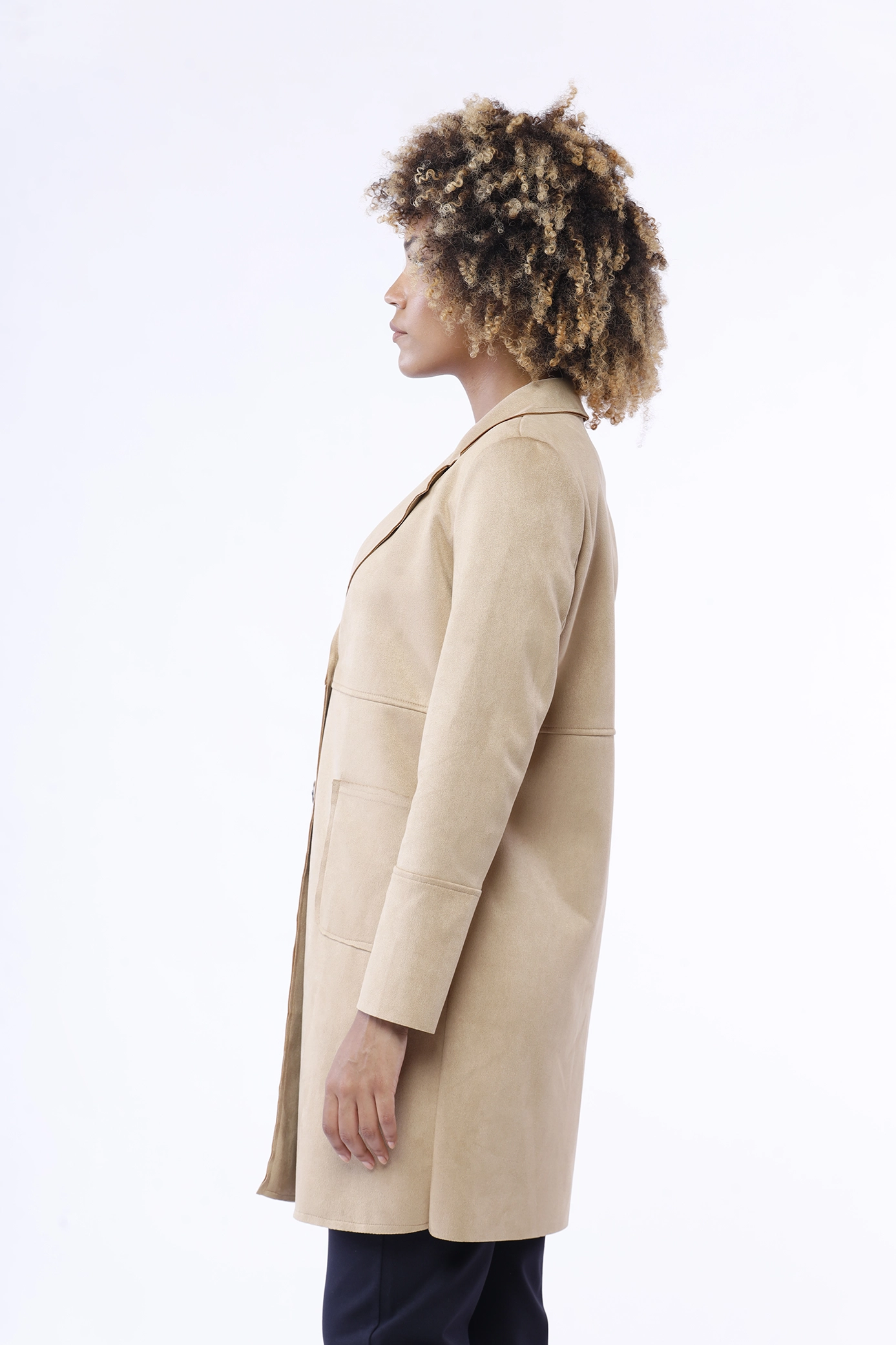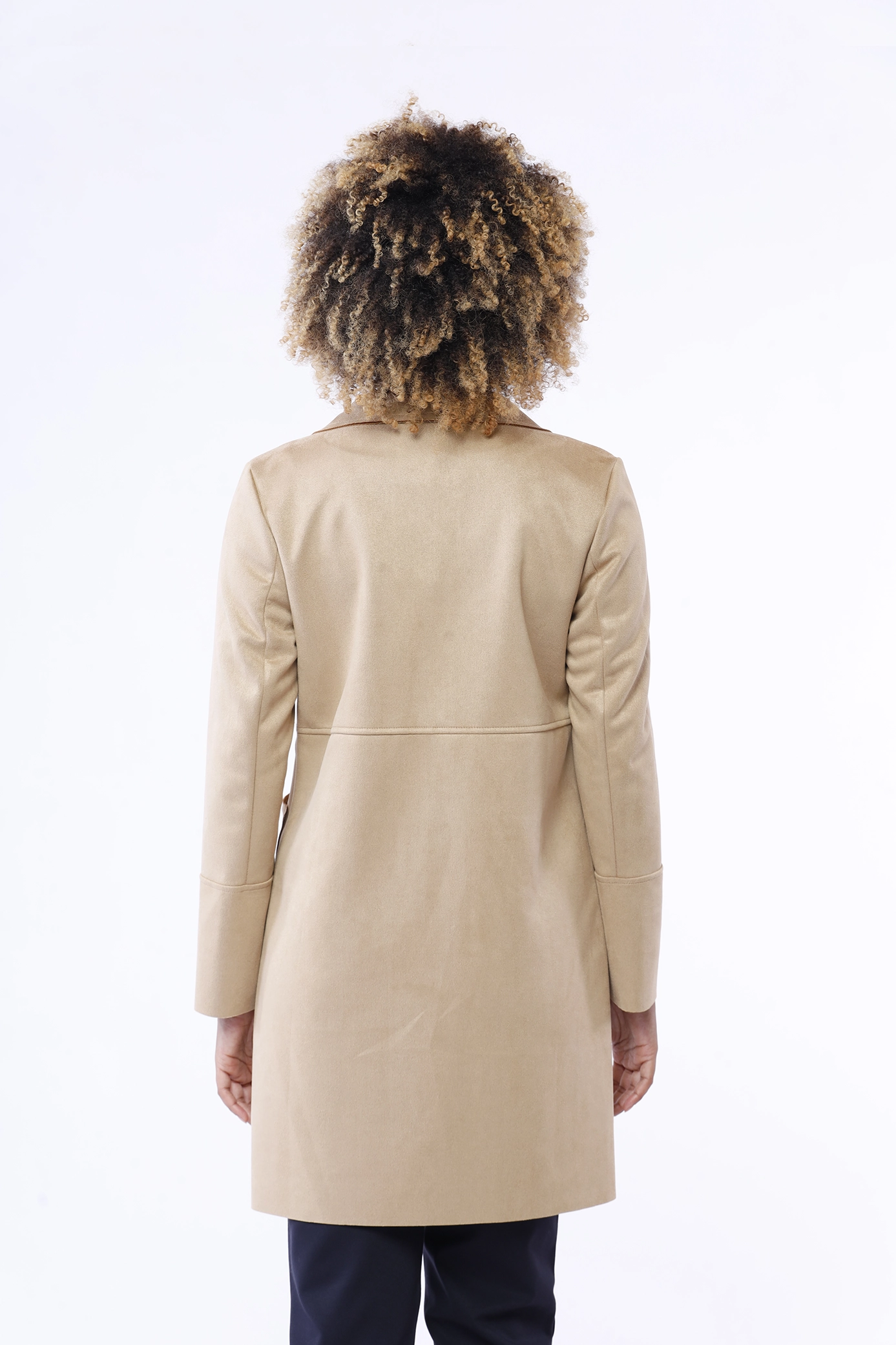 Cappotto lungo in dainetto, monopetto, con cucitura esterna orizzontale al petto e sulle maniche, con collo reverse e comode tasche laterali