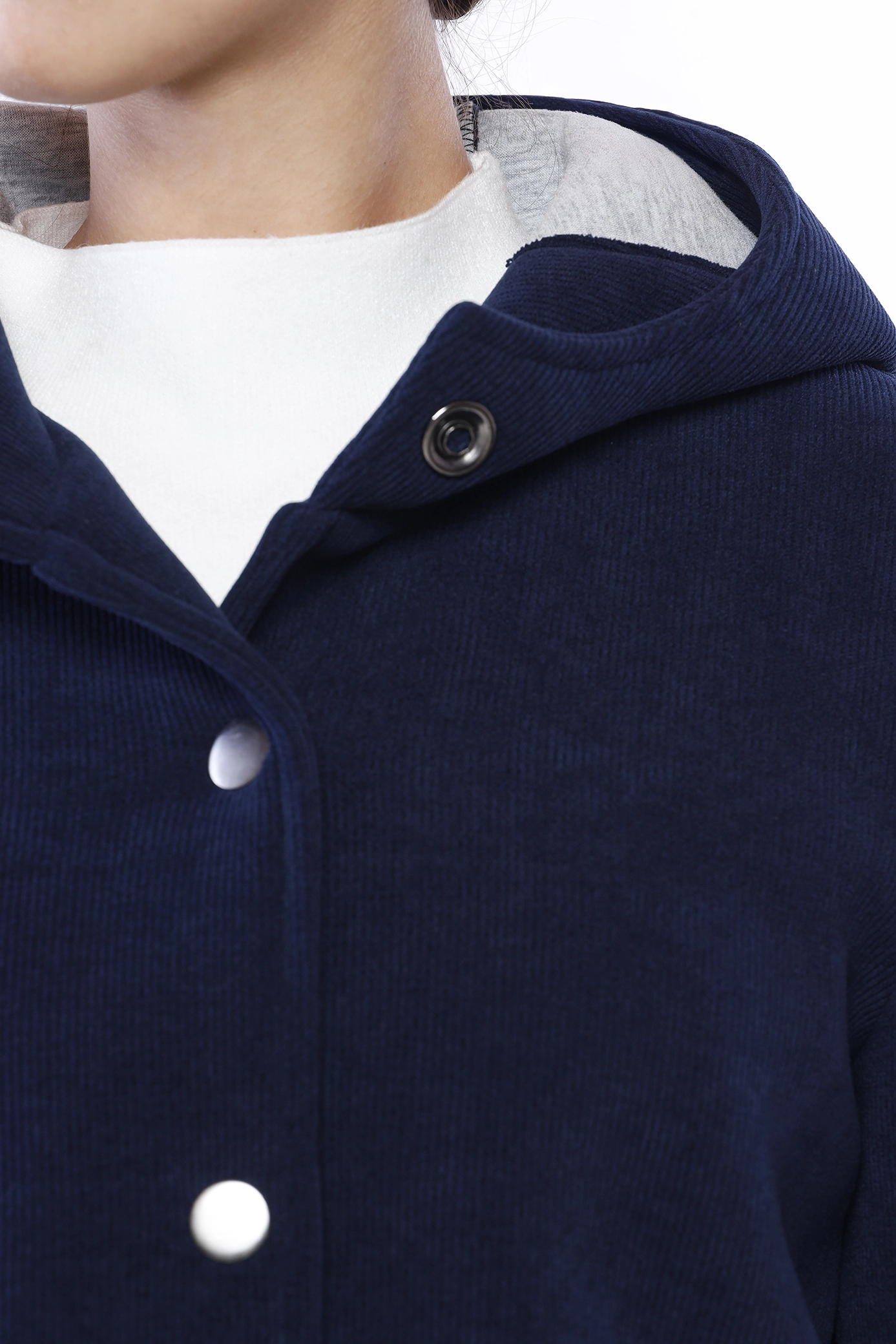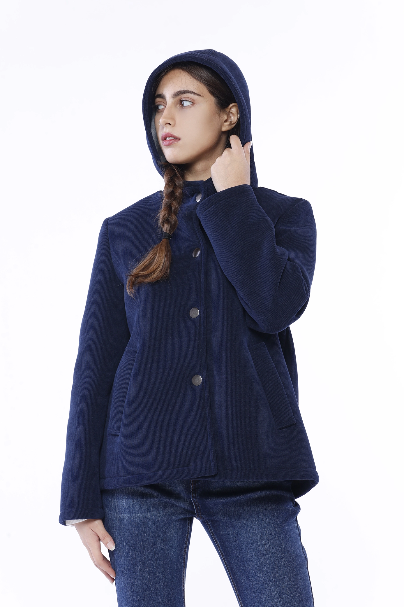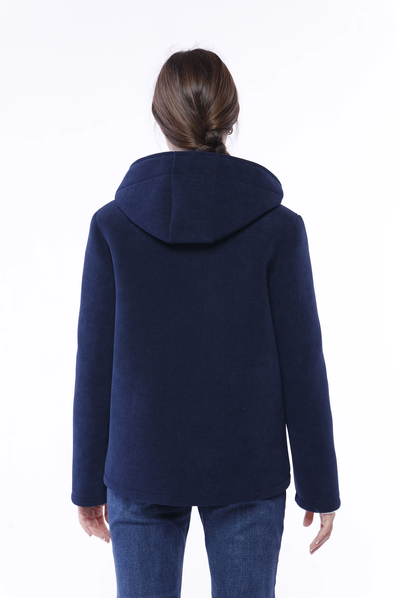 Softshell corto con trama a righe e abbottonatura alta, con cappuccio e comode tasche diagonali