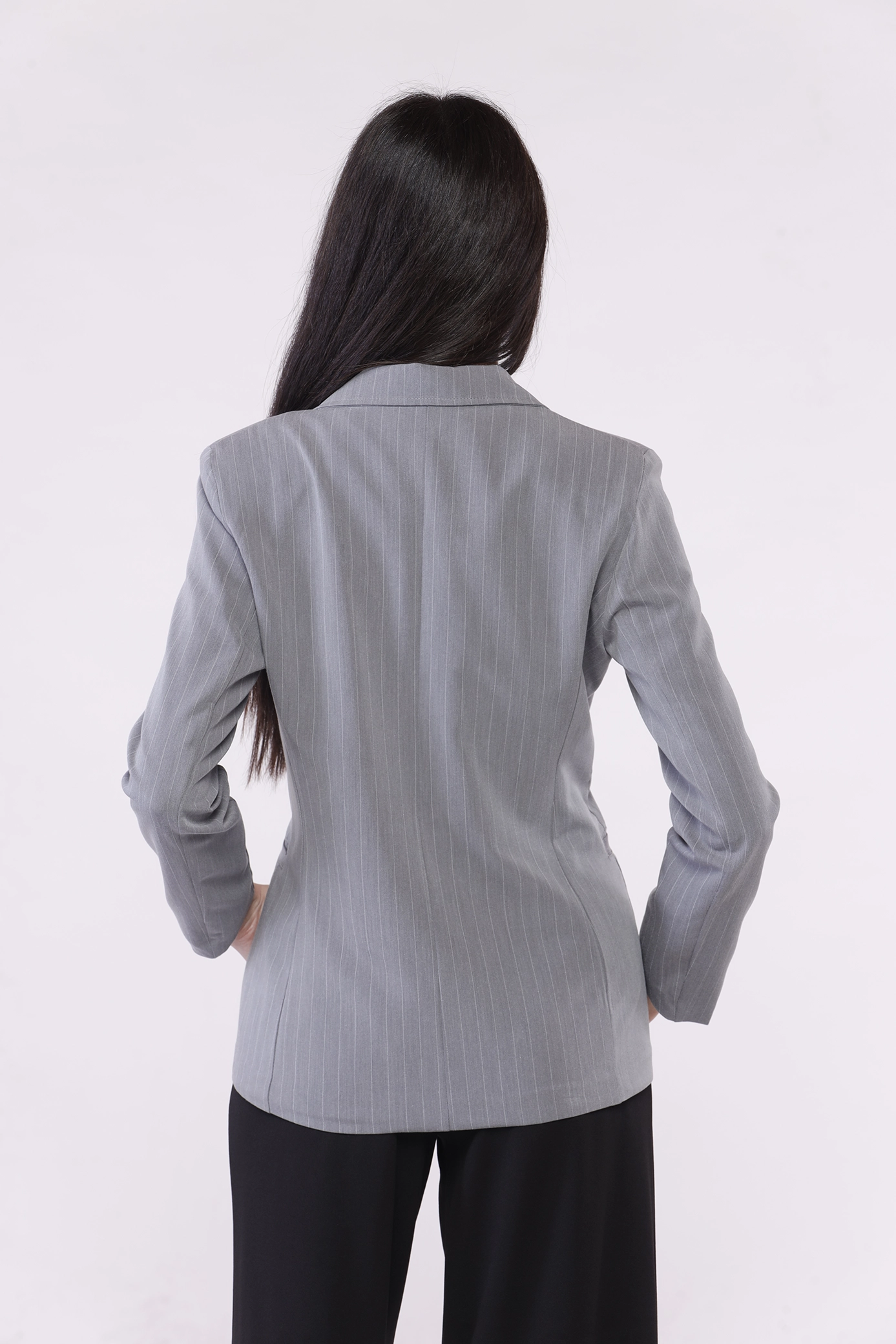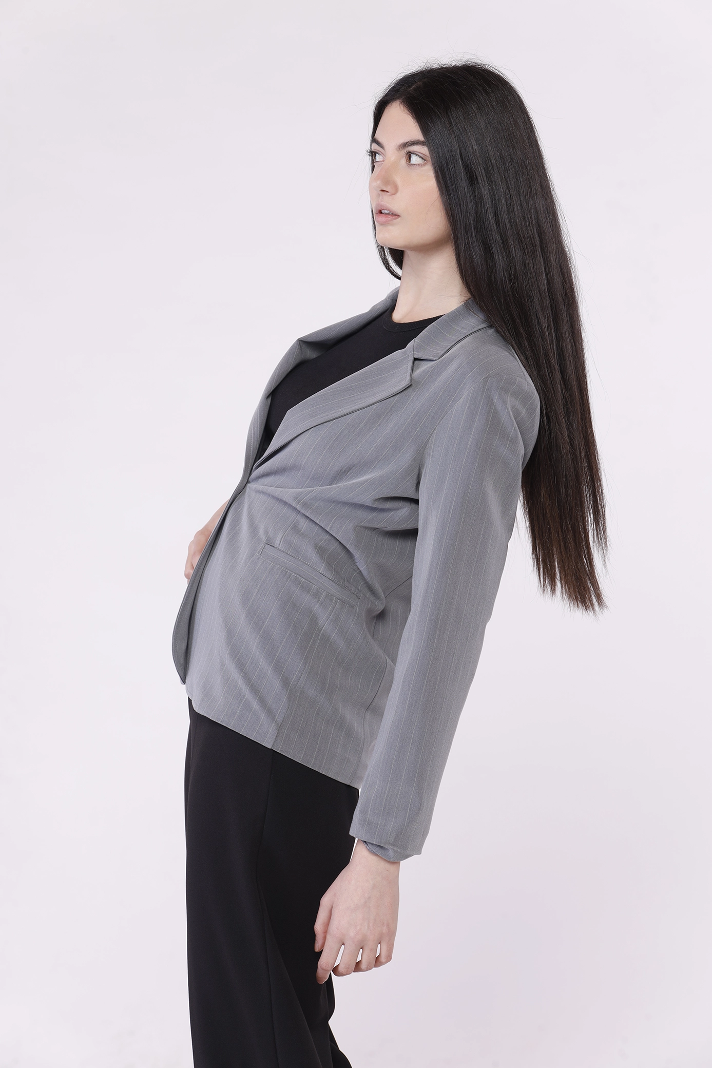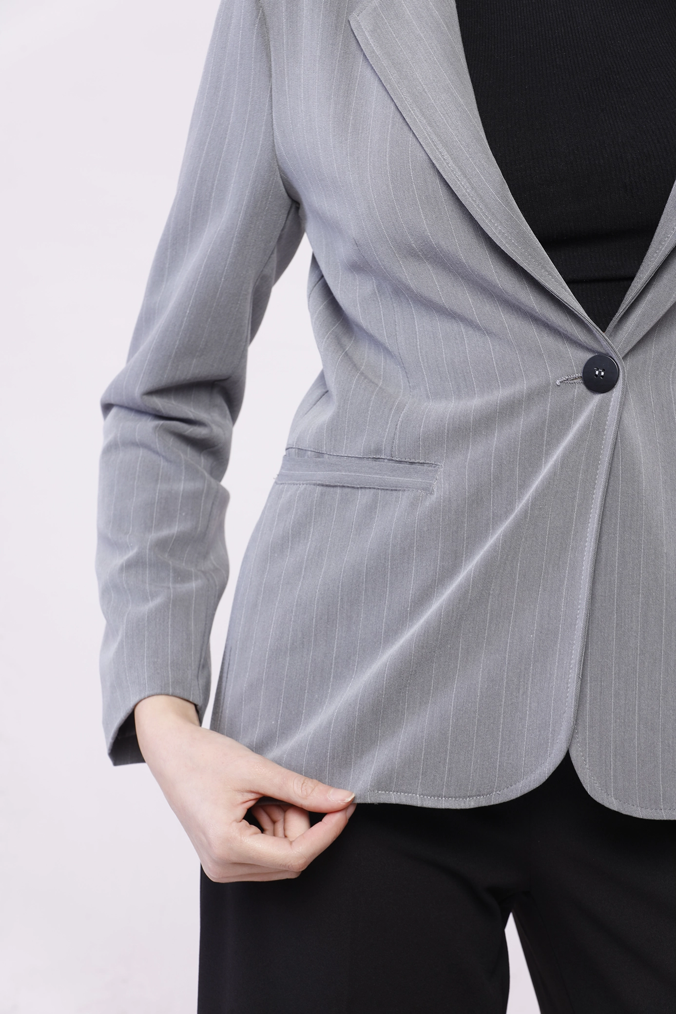 Giacca business woman monopetto gessata, con collo reverse e taschine decorative