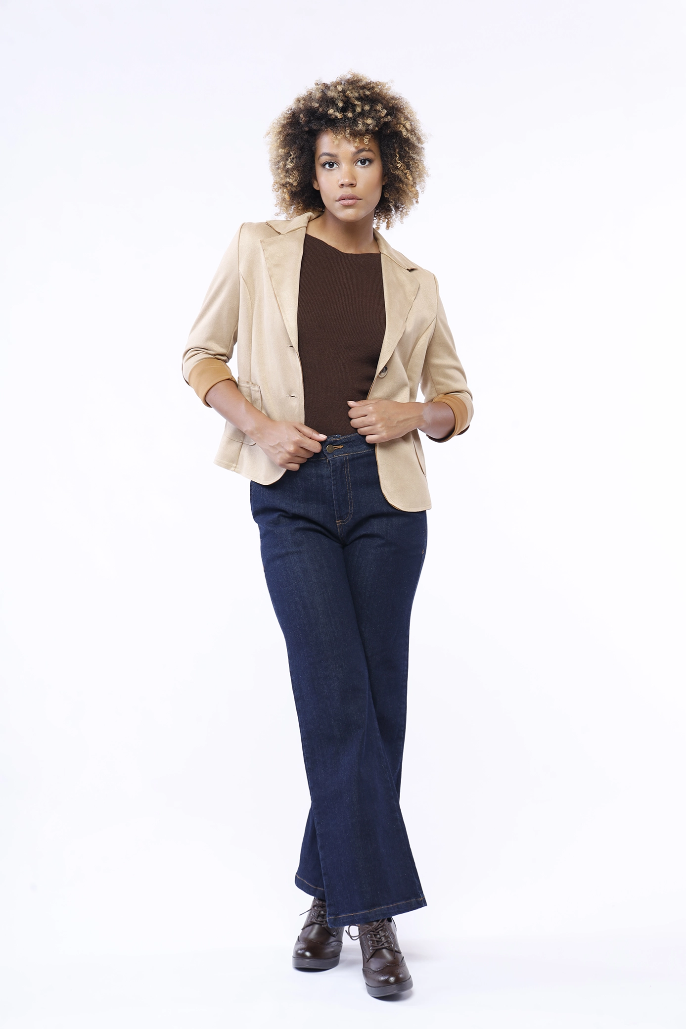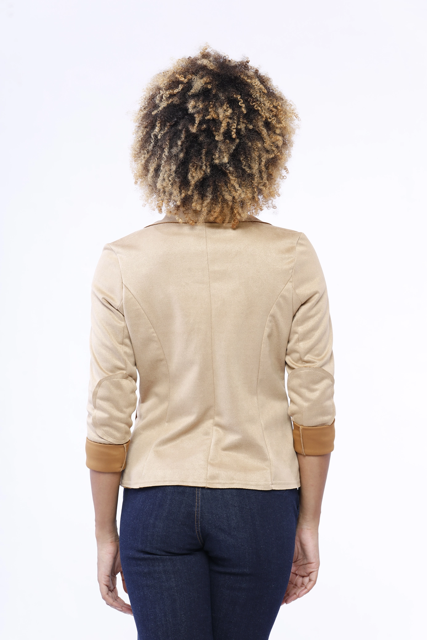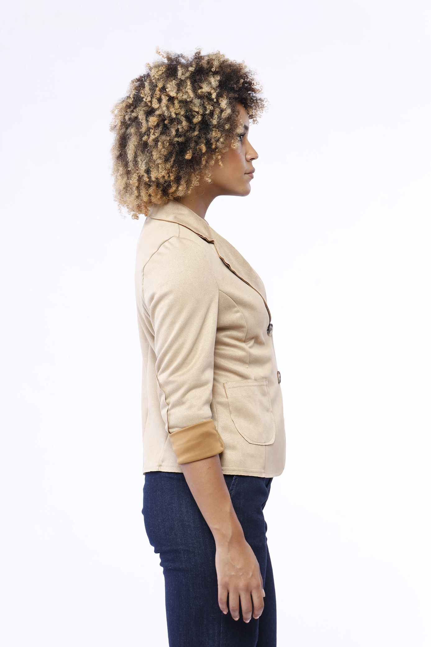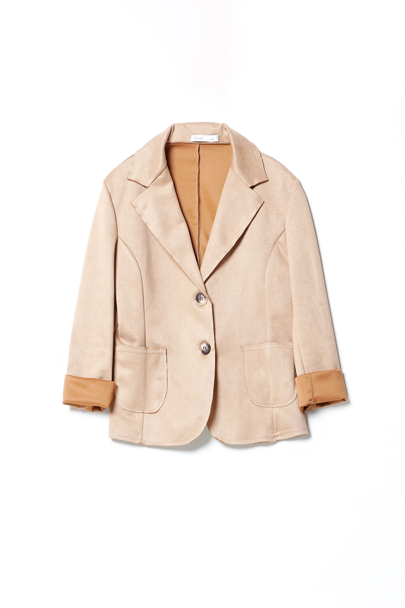 Giacca corta in dainetto, sagomata, con collo reverse, chiusura a due bottoni e taschine laterali