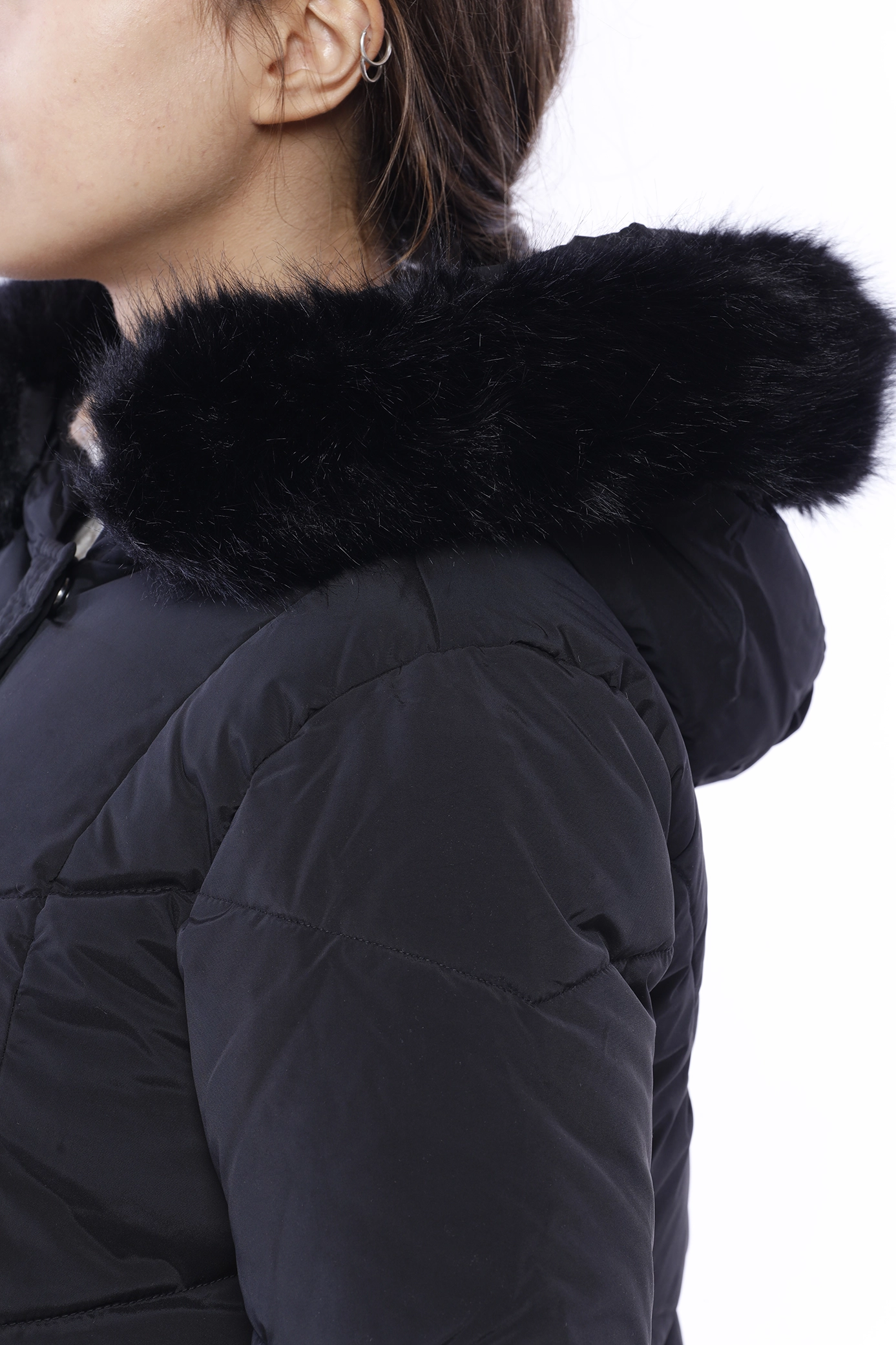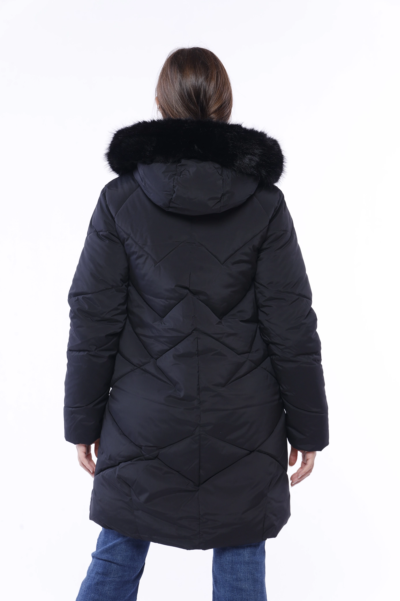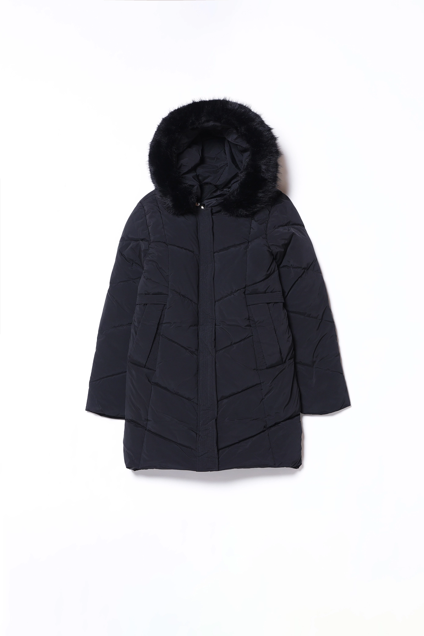 Piumino lungo trapuntato, con pellicciotto sul cappuccio e comode tasche
