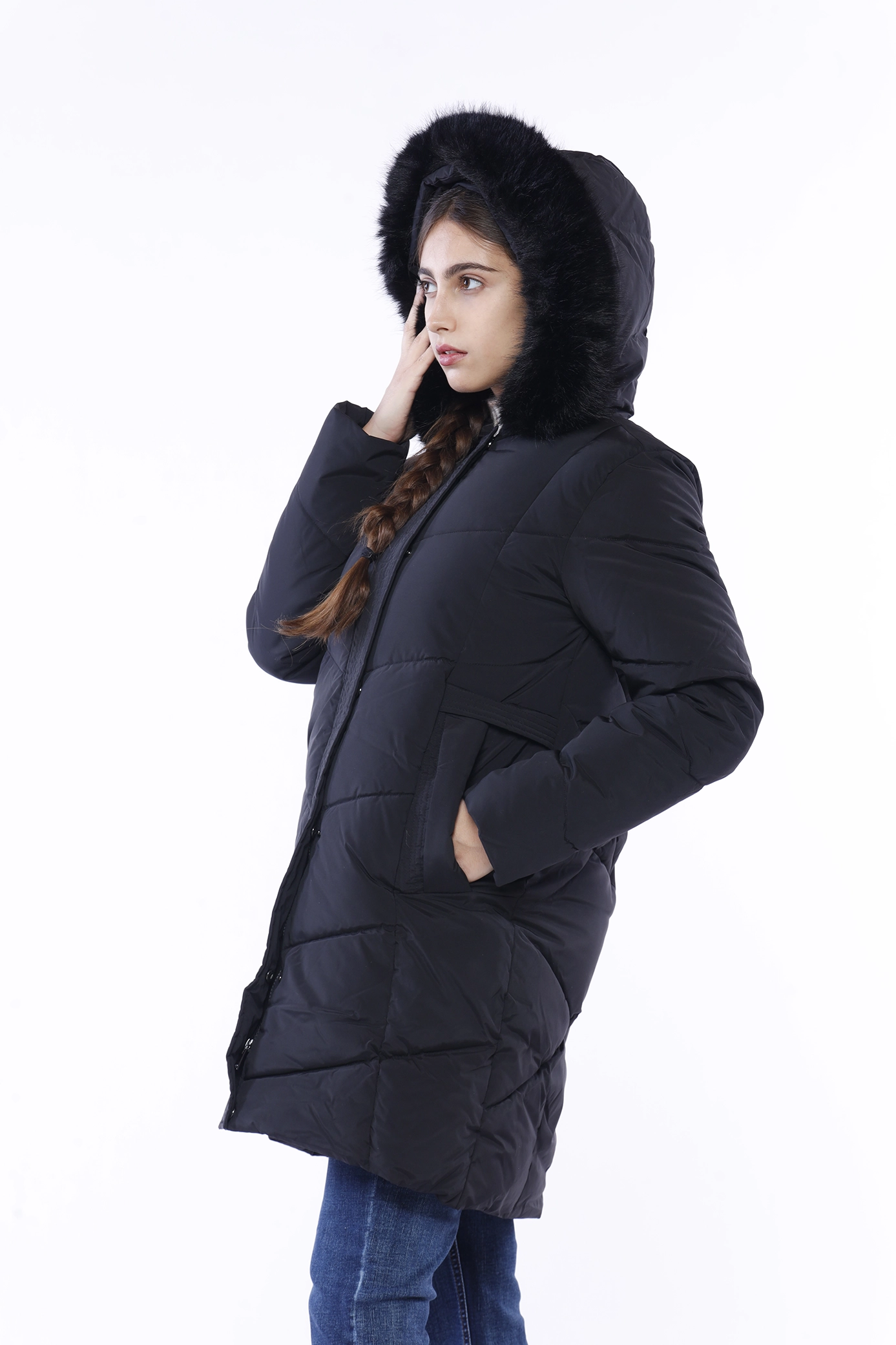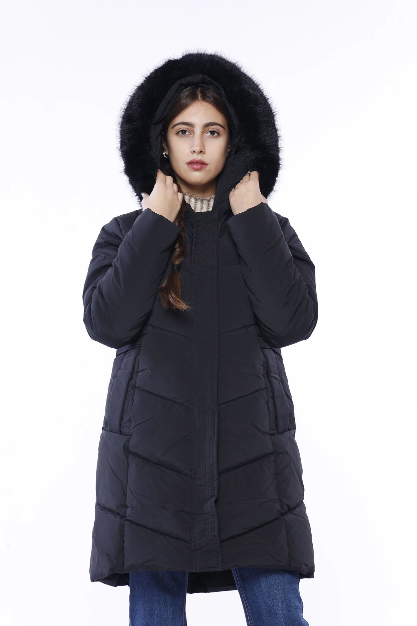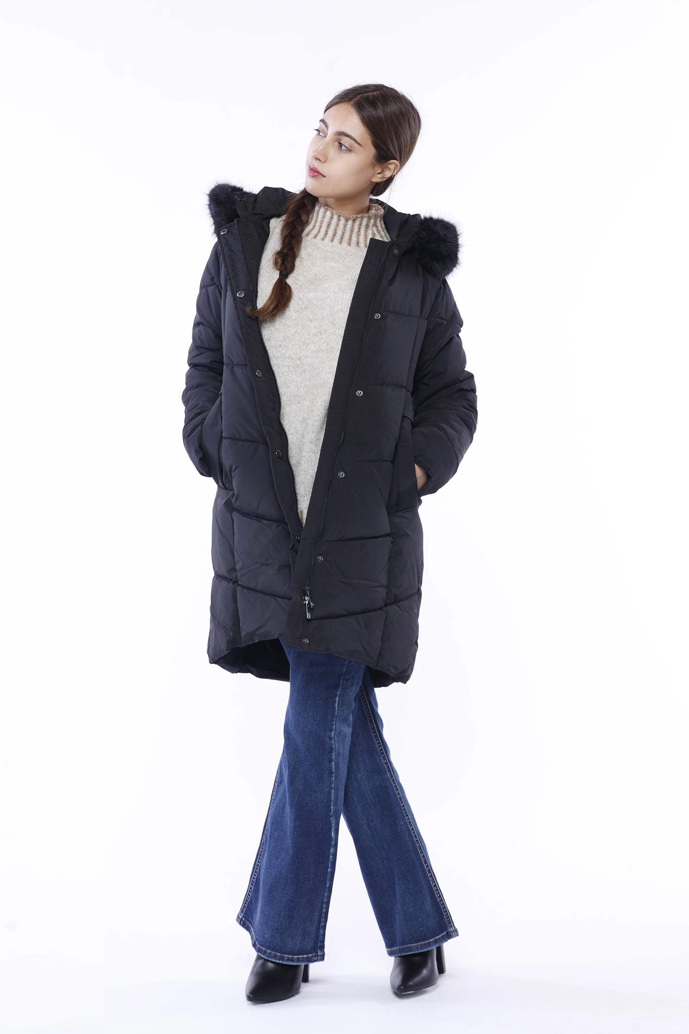 Piumino lungo trapuntato, con pellicciotto sul cappuccio e comode tasche