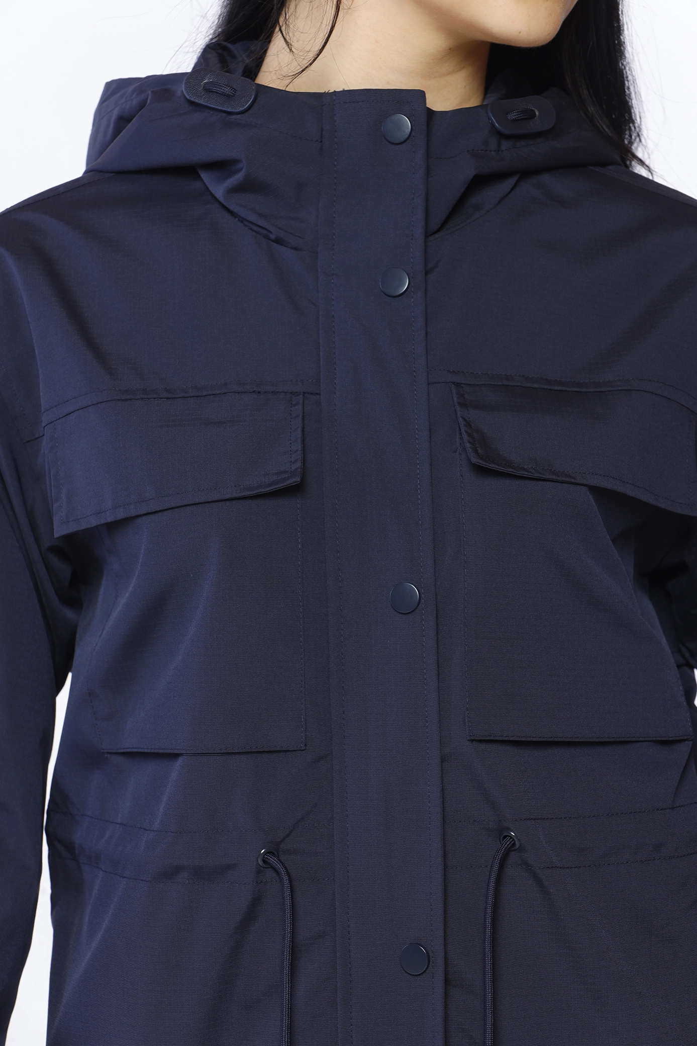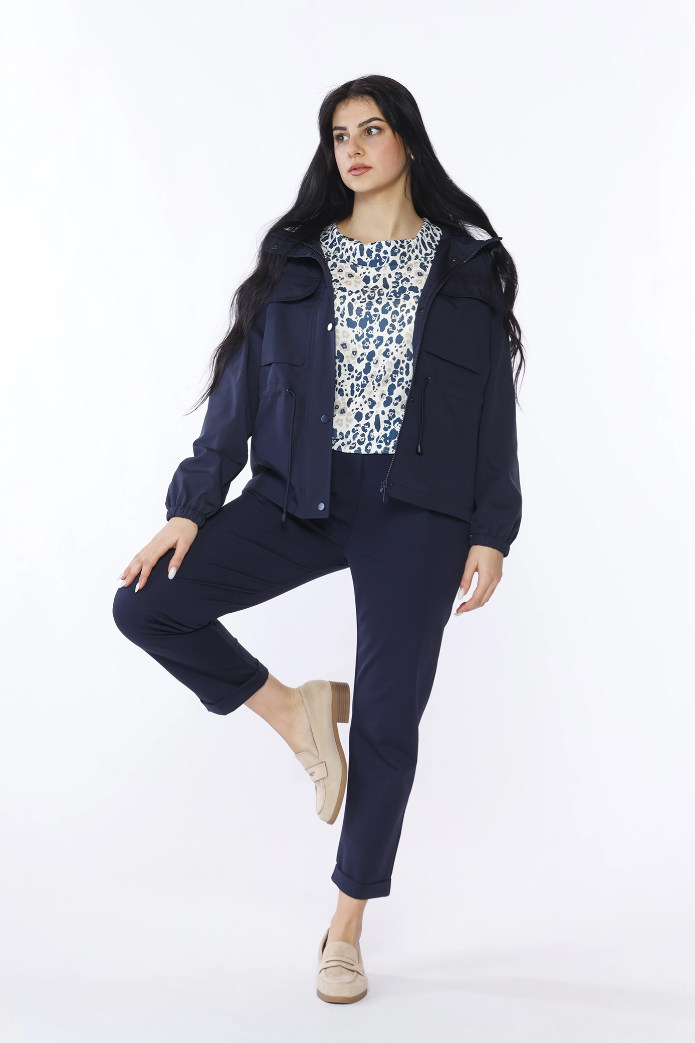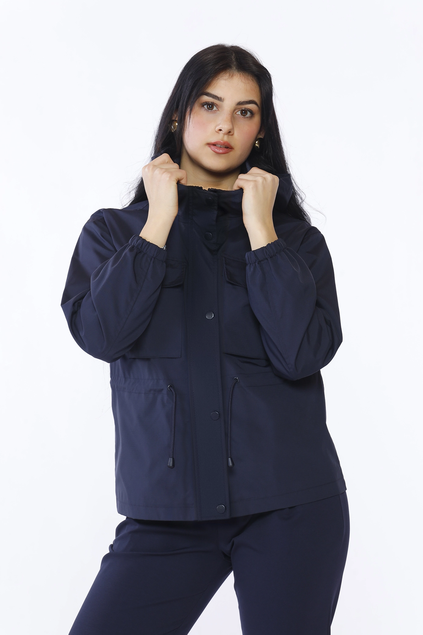 Giacca casual tipo parka, con doppia chiusura a zip e bottoni, cappuccio antipioggia e comodi tasconi sul davanti