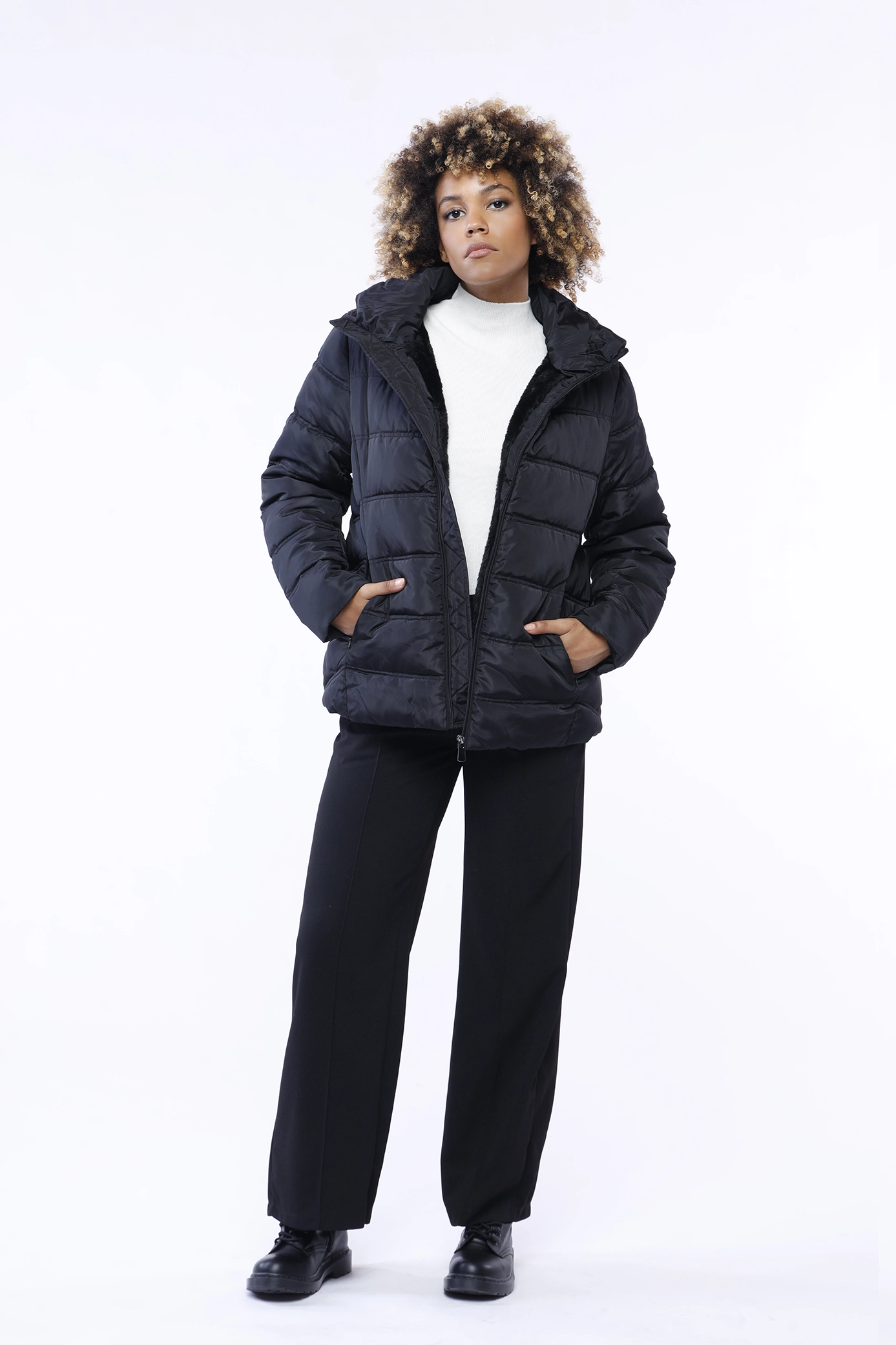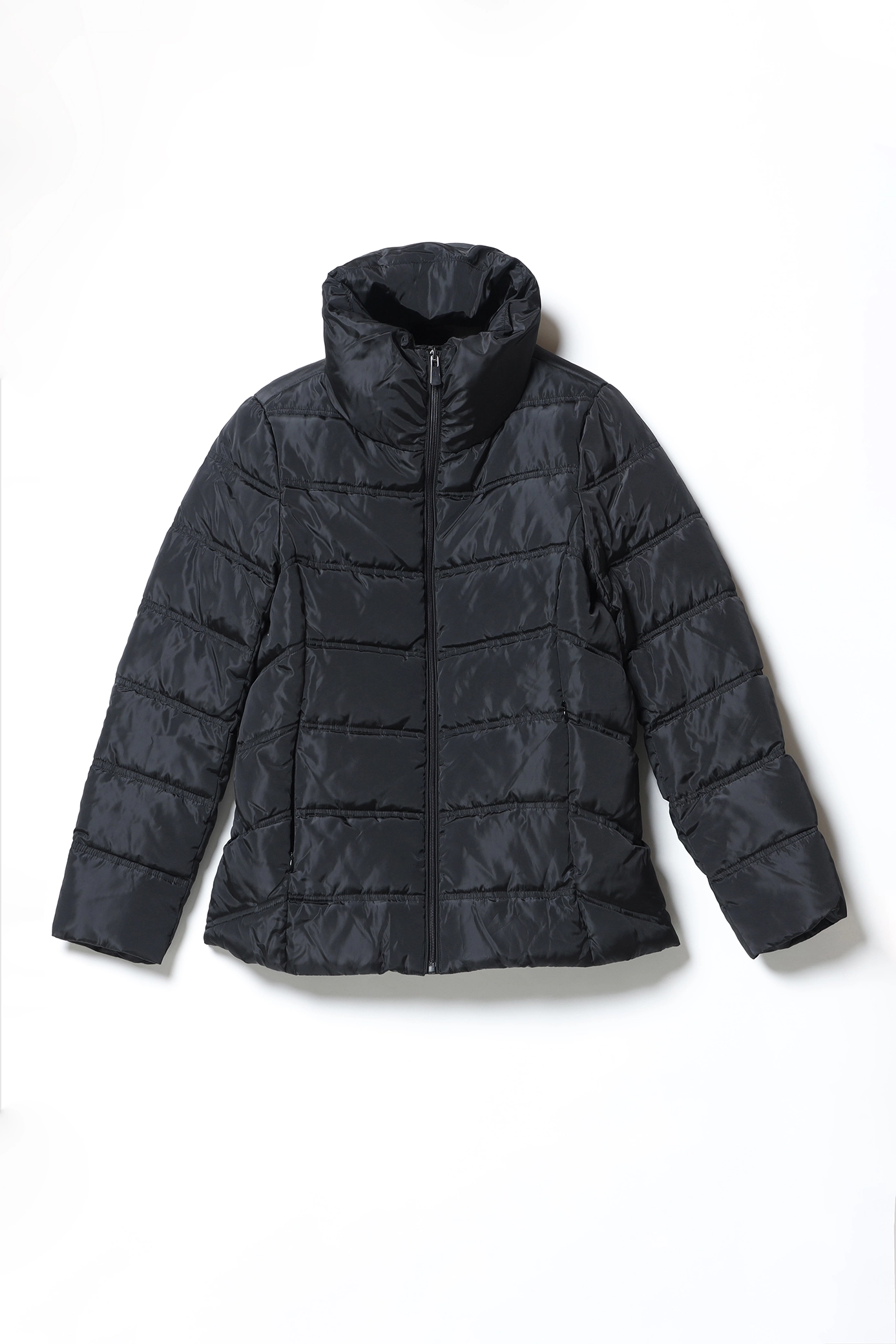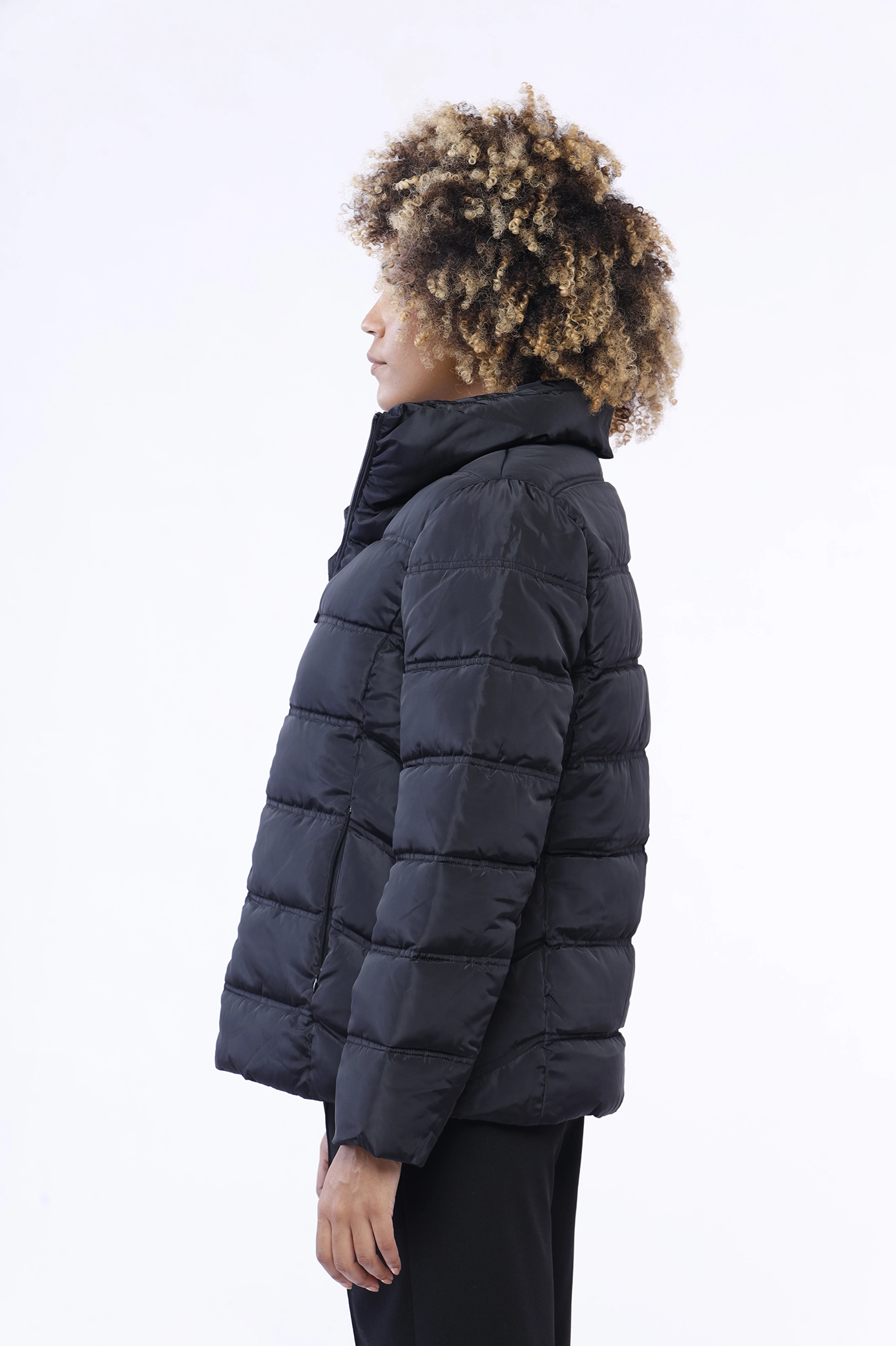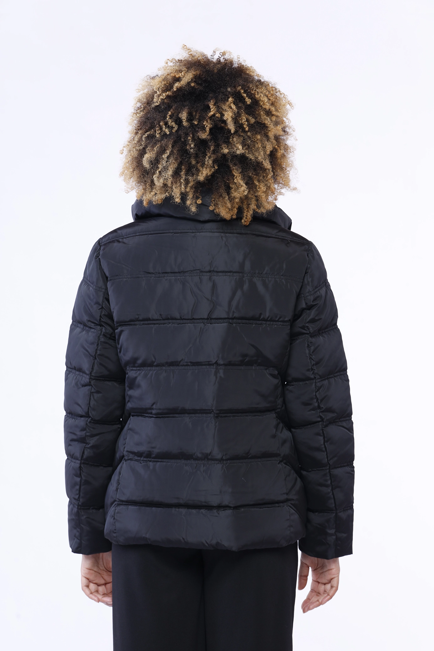 Piumino corto sagomato, con chiusura a zip e con comode tache a filetto chiuse con cerniera