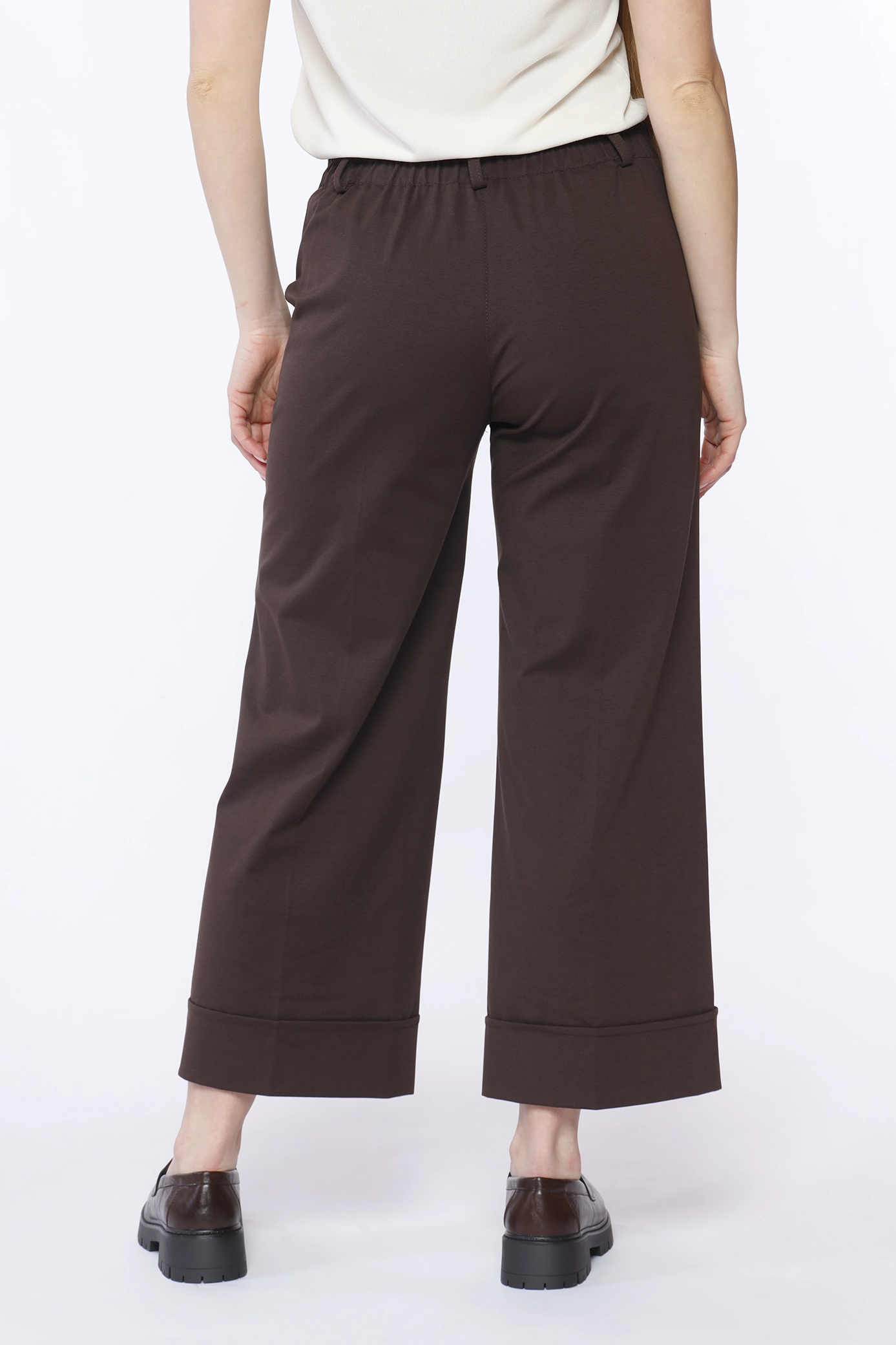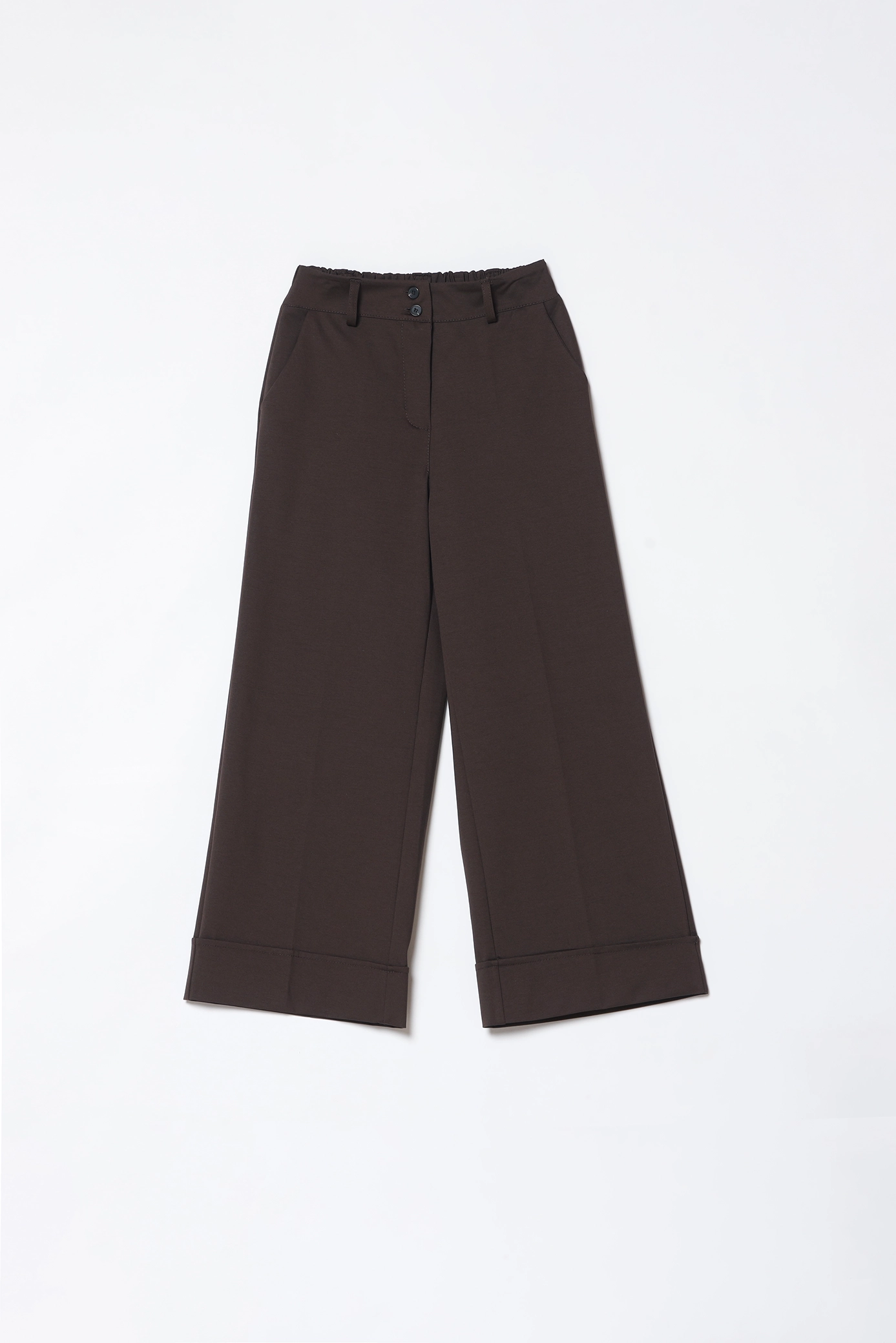 Pantalone wide leg, con orlo alto alle caviglie, elastico posteriore arricciato, passanti alla cintura e tasche laterali