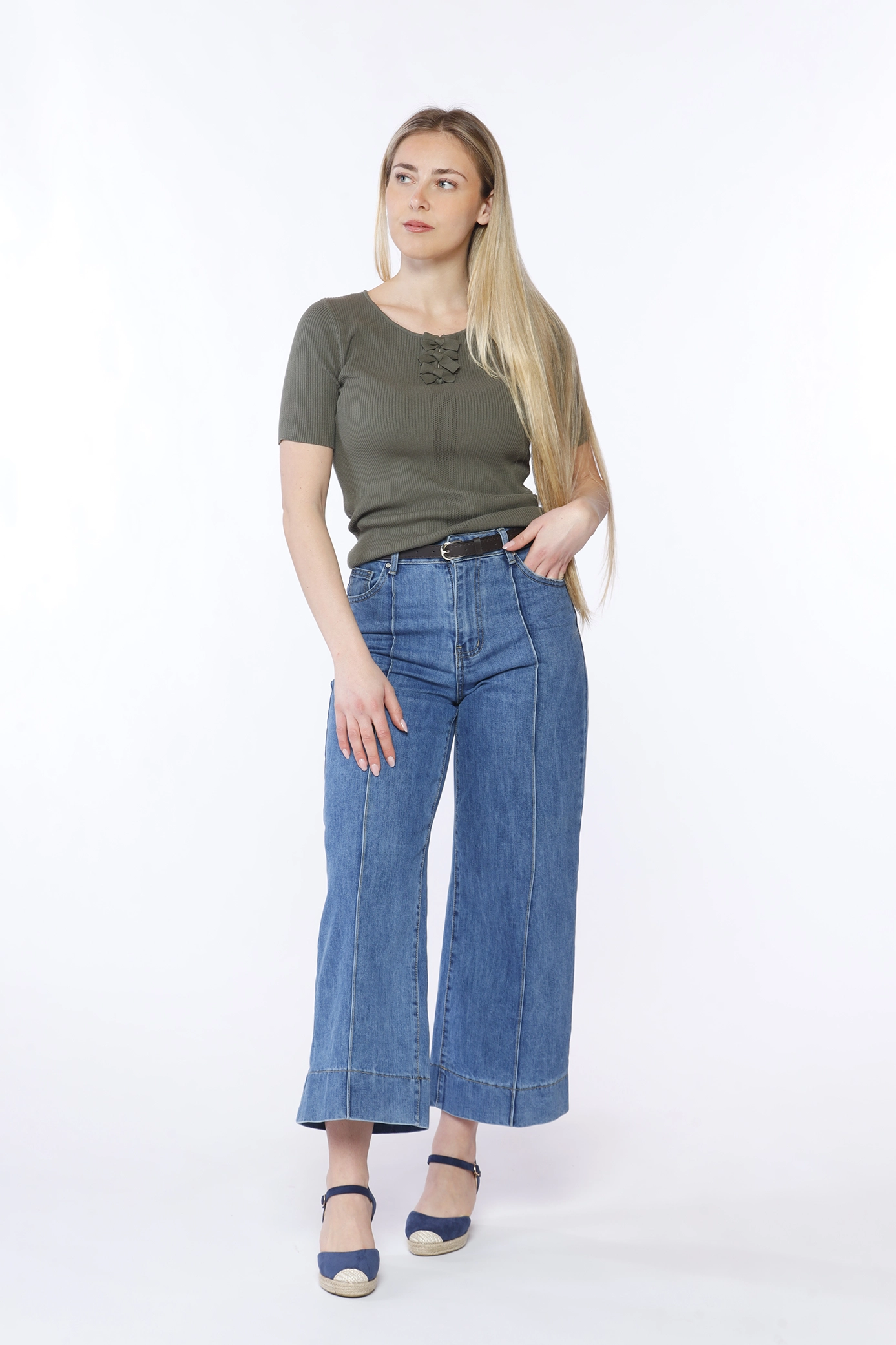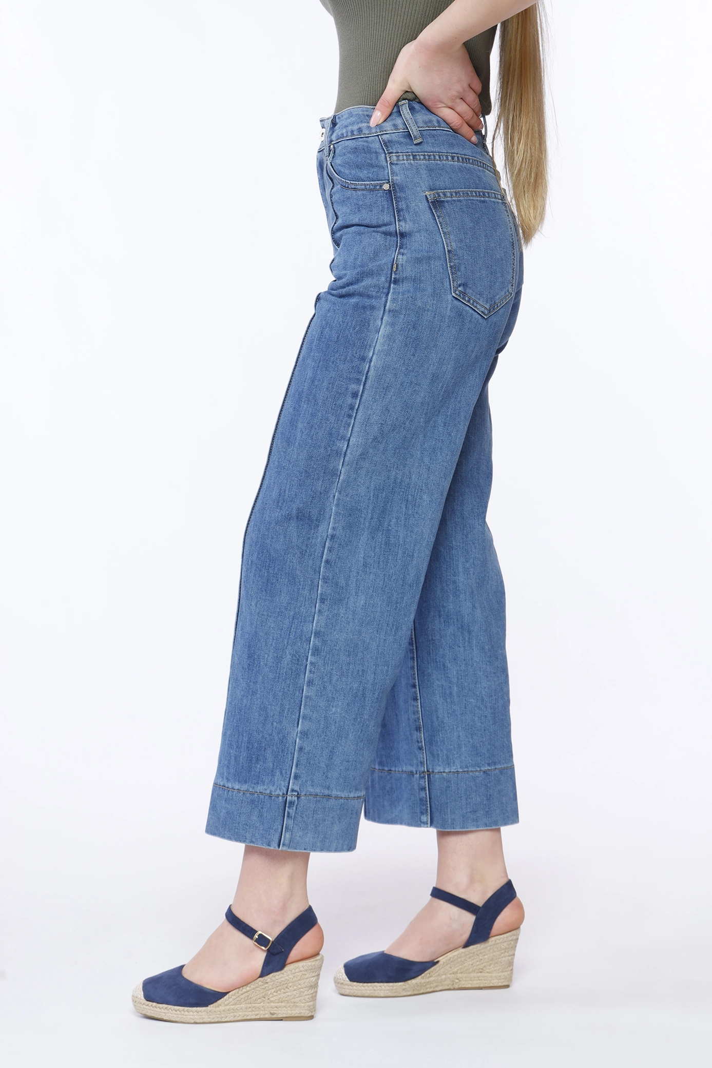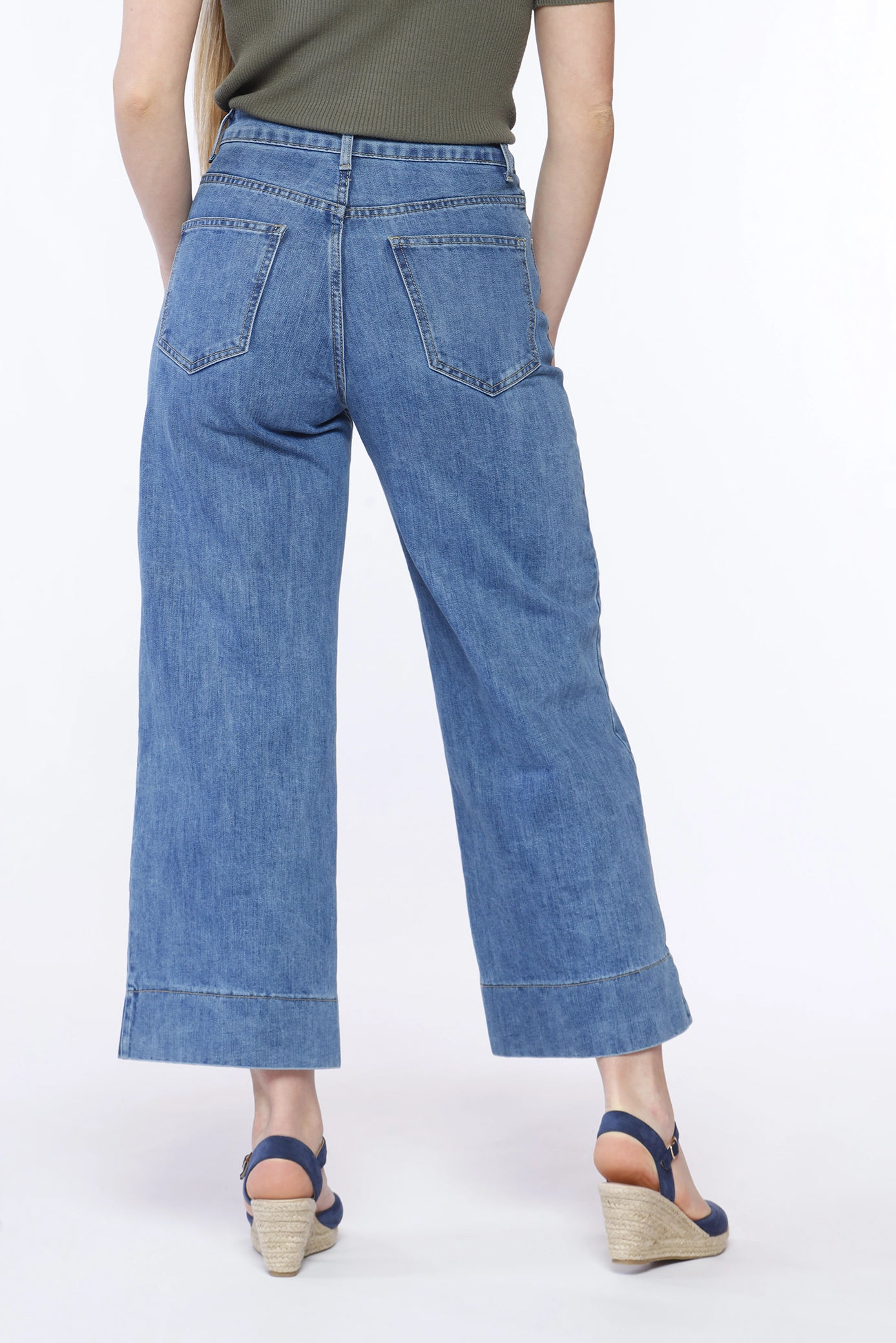 Jeans a gamba larga con cucitura verticale e orli alti alle caviglie, comode tasche laterali e chiusura con bottone