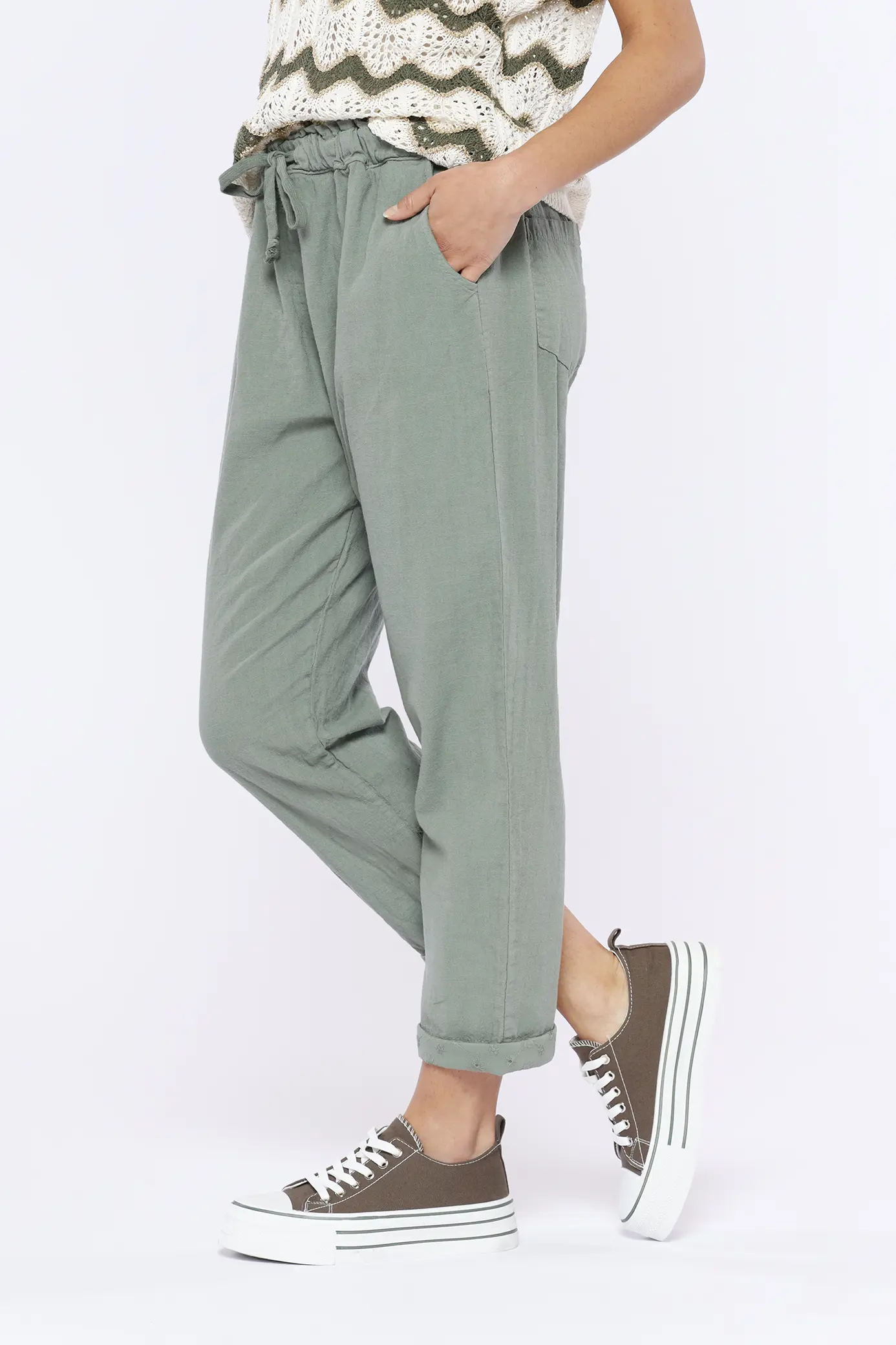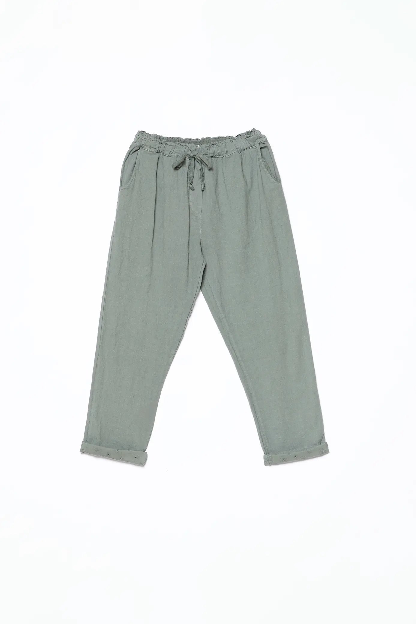 PANTALONE in fresco lino misto a cotone con pratico laccetto in vita e graziosi risvolti sangallo